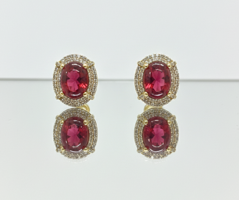 These exquisite stud earrings draw inspiration from classic Art Deco jewelry. At the heart of each piece is a vibrant green cabochon stone, likely emerald or high-quality onyx, which provides a deep, saturated pop of color. The center stone is meticulously framed by two distinct tiers of sparkle: an inner halo of round brilliant-cut crystals and an outer “sunburst” halo of baguette-cut crystals. Set in a polished gold-toned mounting, these earrings offer a balanced, symmetrical design that feels both regal and modern.