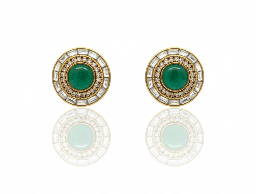 Timeless gold-toned circular studs featuring a rich green cabochon center framed by a dual halo of brilliant-cut and baguette crystals.