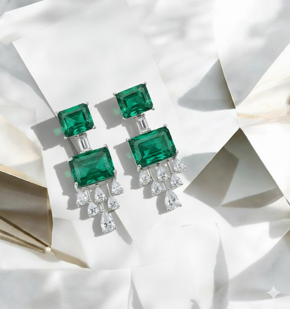 Command attention with the breathtaking elegance of these Emerald and Diamond Chandelier Earrings. At the heart of each piece are two significant, deep-green emeralds, meticulously cut into classic rectangular shapes to maximize their natural luster and depth.