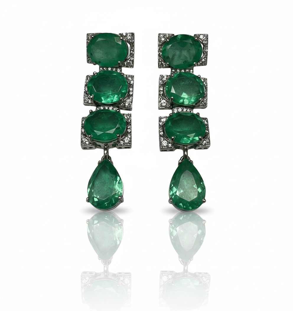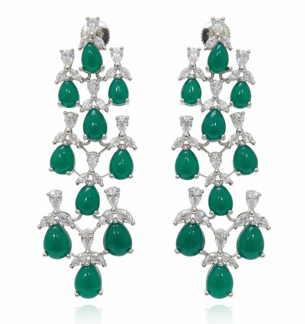 Elevate your evening ensemble with these breathtaking emerald green chandelier earrings. Featuring a regal combination of emerald-cut and teardrop gemstones set against a brilliant diamond-simulated lattice, these earrings offer a mirror-finish reflection and timeless sophistication for any high-profile occasion.