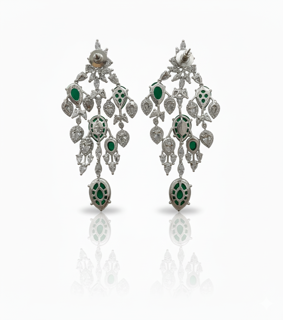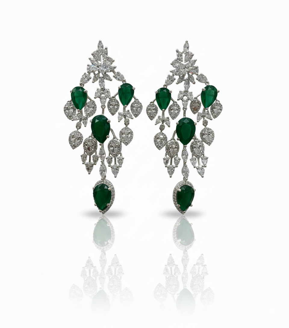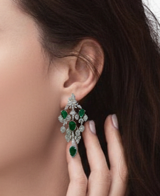 Exquisite chandelier earrings featuring rich emerald-green gemstones framed by shimmering diamond accents, crafted in a graceful, heirloom-inspired silhouette.