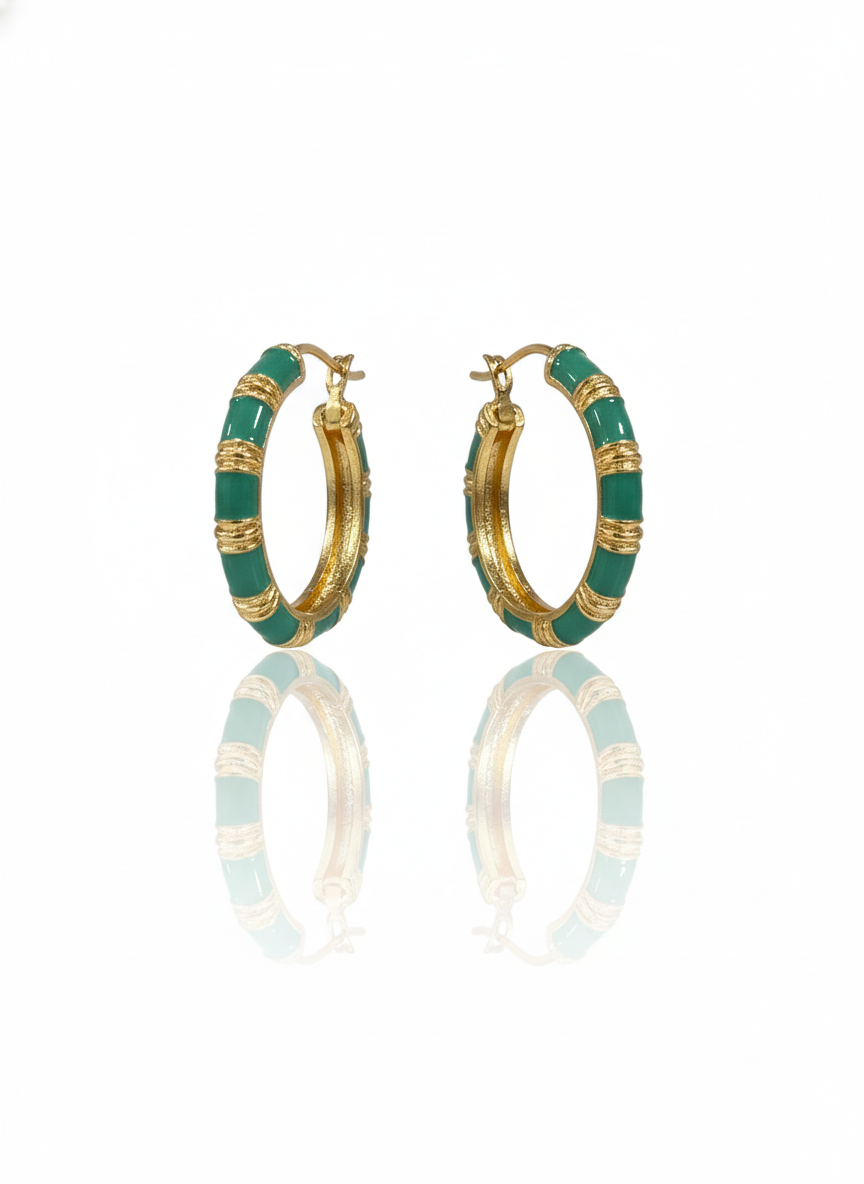 These elegant hoop earrings feature a rich emerald-green enamel finish accented with textured gold-tone detailing. The segmented design adds depth and sophistication, creating a refined balance between bold color and classic luxury. Crafted with a secure post-back closure, these hoops are comfortable for everyday wear while making a polished statement. Perfect for adding a pop of color to both casual and dressy looks, they offer timeless charm with a modern twist.