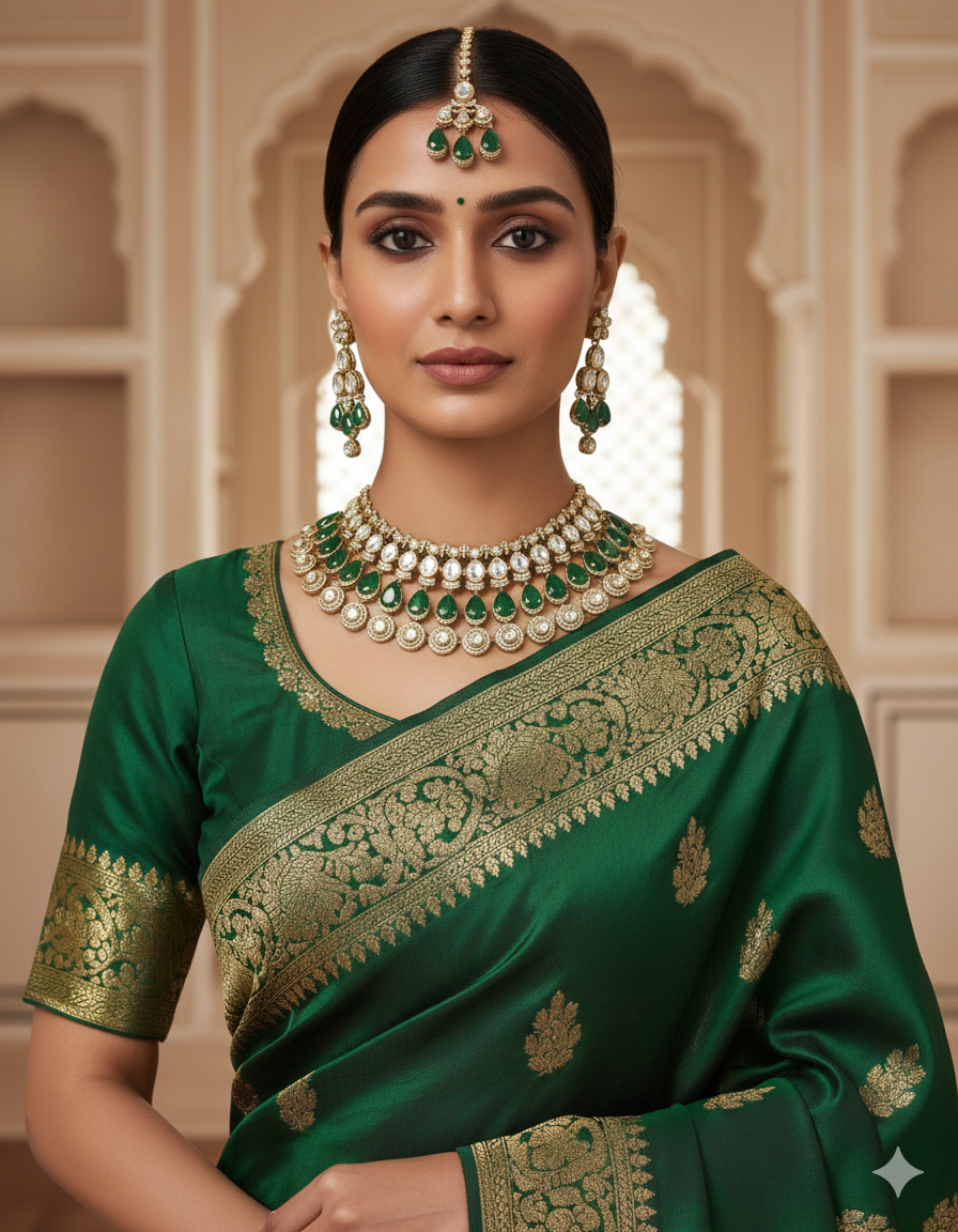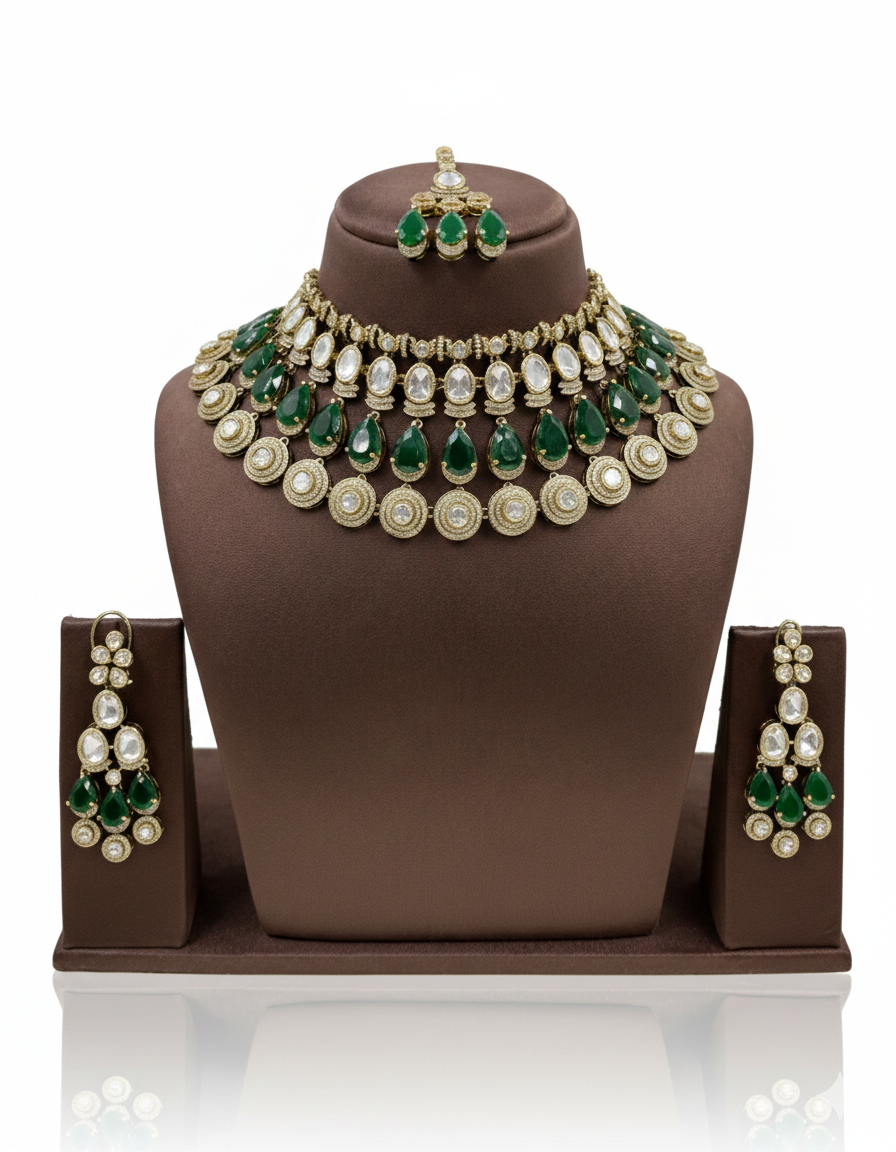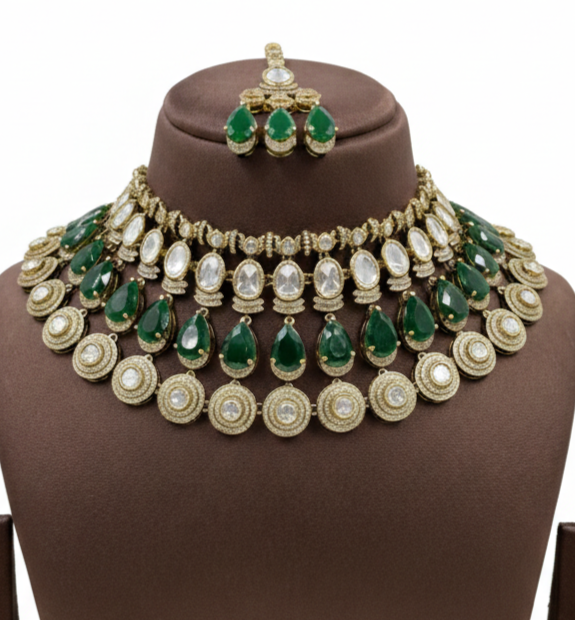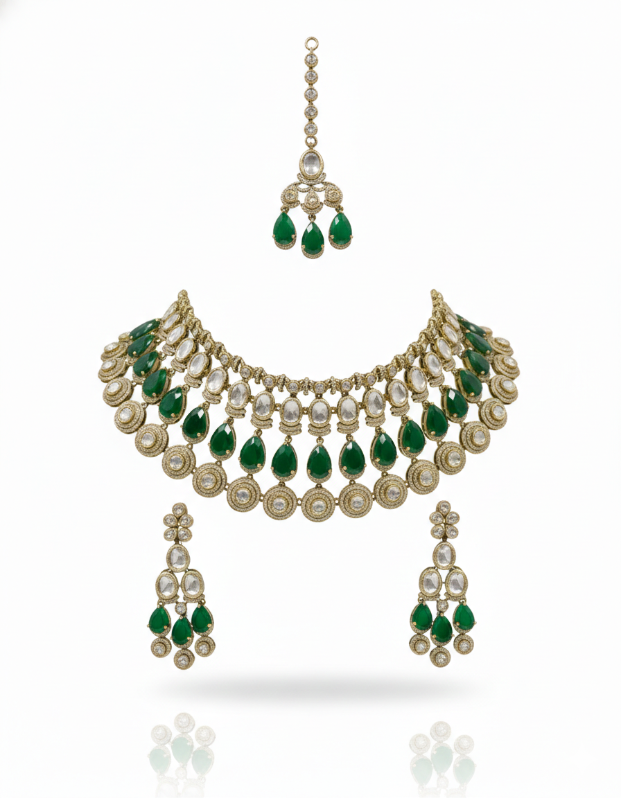 Elevate your bridal look with the exquisite craftsmanship of the Emerald Enchantment set. This statement choker is designed with three distinct tiers of luxury: a delicate top band of Polki stones, a middle row of striking emerald-green pear-shaped drops, and a final tier of circular Polki medallions.