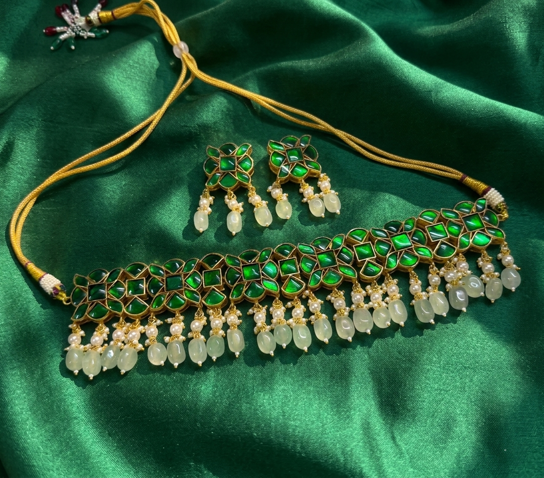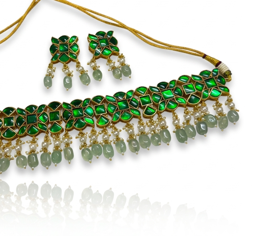 A breathtaking gold-toned choker featuring geometric emerald-green stone inlays and a delicate fringe of mint-green drops and seed pearls. Paired with matching floral-motif earrings, this set is a regal choice for weddings and festive silk ensembles.