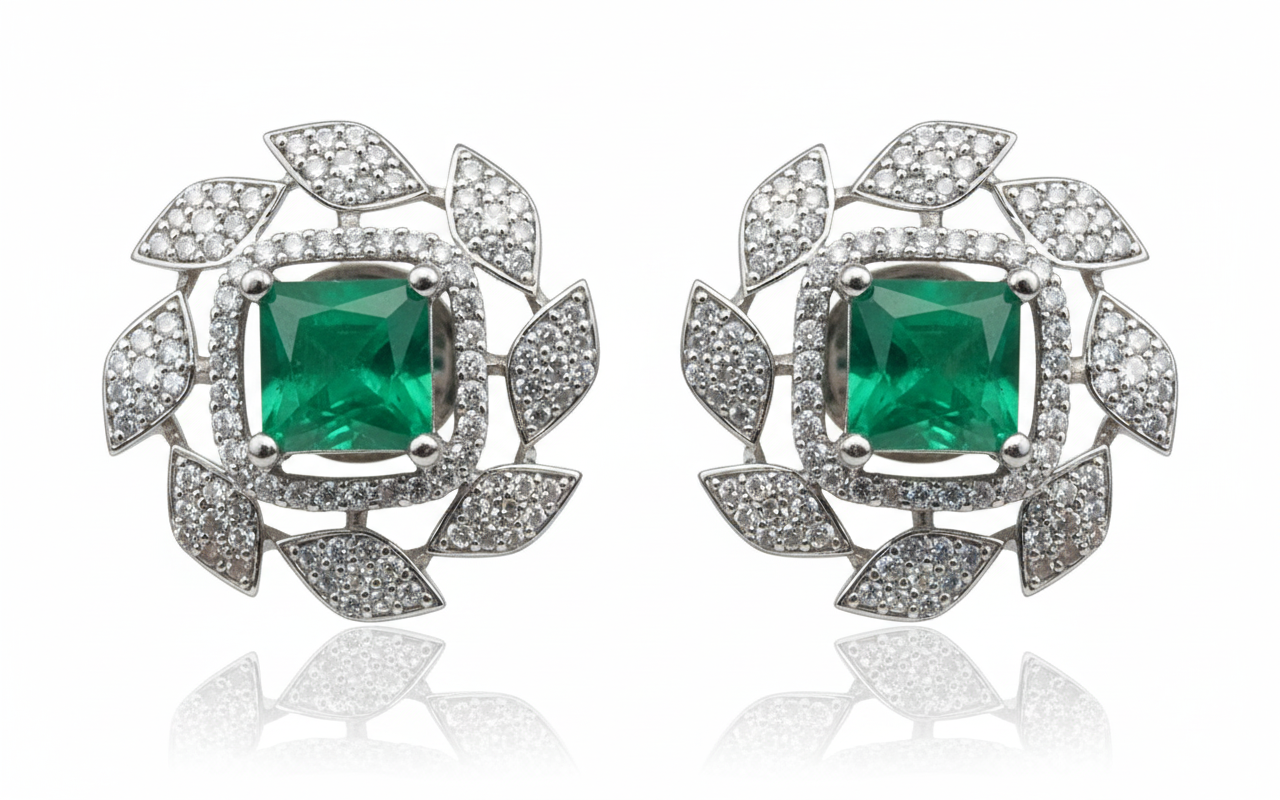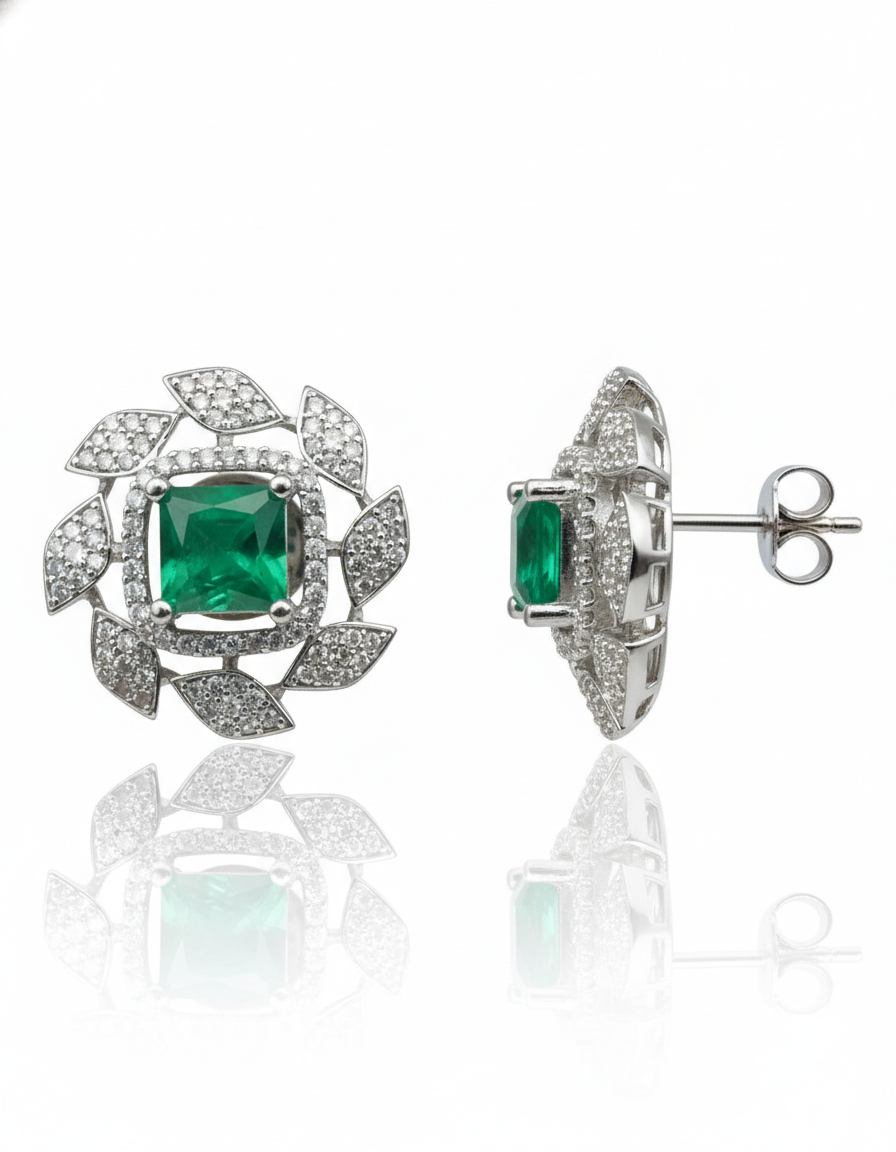 Make a bold statement with these Emerald Green Square Halo Leaf Motif Stud Earrings. Designed to mimic the beauty of a blooming garden, these earrings combine rich color with detailed craftsmanship: