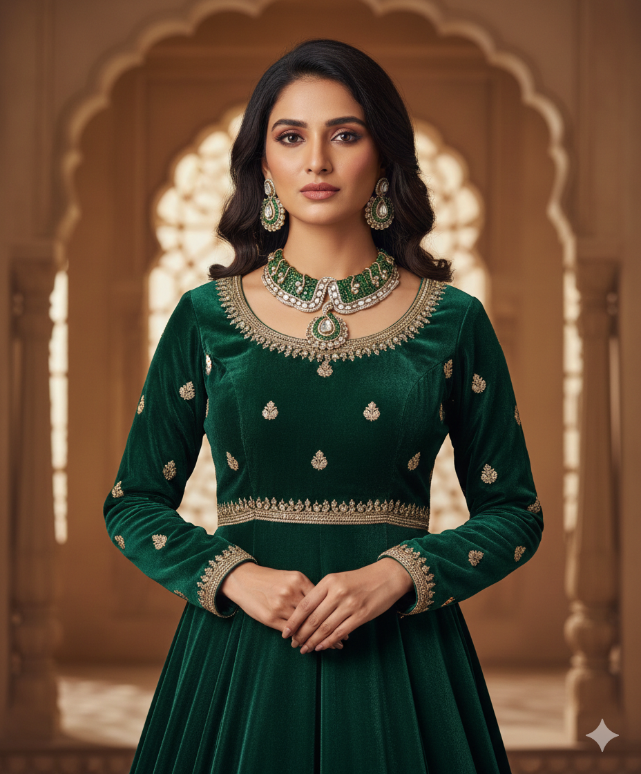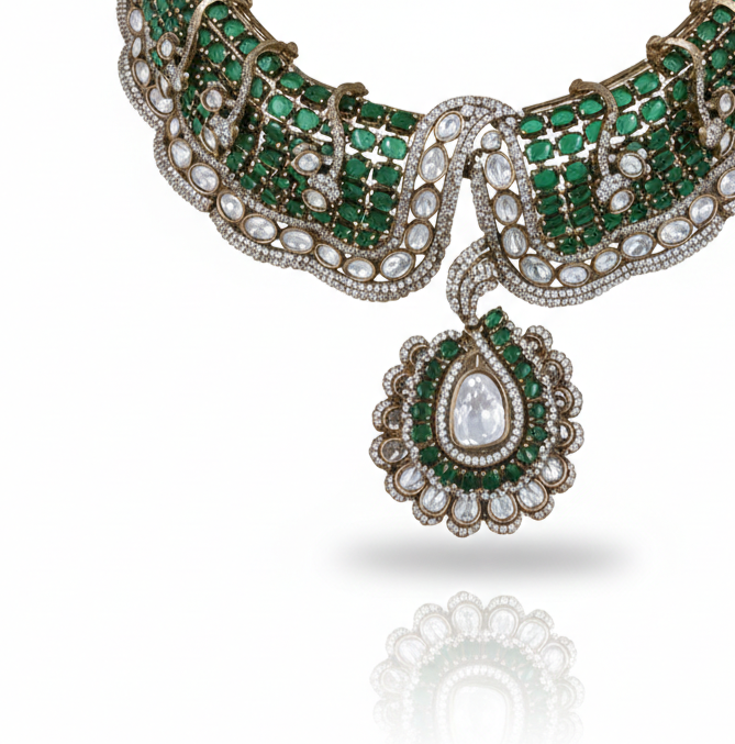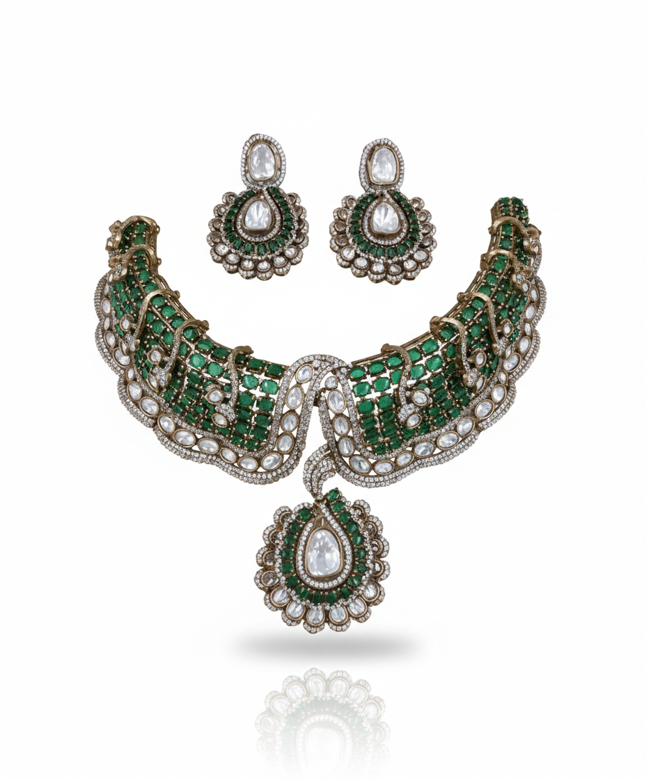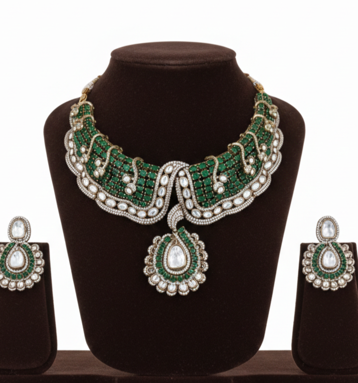 This stunning bridal choker necklace set showcases a luxurious arrangement of emerald green stones paired with shimmering white kundan-style accents. The broad choker design sits gracefully on the neckline, highlighted by an elegant teardrop pendant that adds a regal finishing touch. Matching drop earrings mirror the intricate detailing of the necklace, creating a perfectly coordinated look. Ideal for weddings, receptions, and grand festive occasions, this statement set exudes sophistication and timeless charm, making it a must-have for traditional and bridal wear.