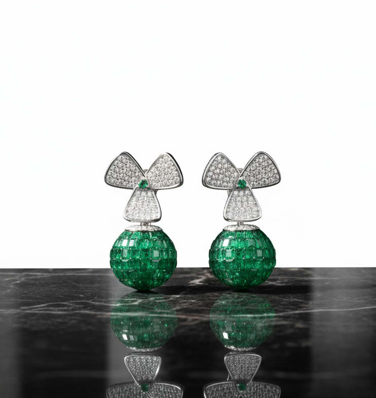 Embody regal elegance with these architectural drop earrings, featuring a magnificent sphere of invisibly set emeralds. Suspended from an elegant tri-fan stud encrusted with brilliant diamond pavé, these earrings offer a bold, three-dimensional silhouette that defines modern high-jewelry luxury.