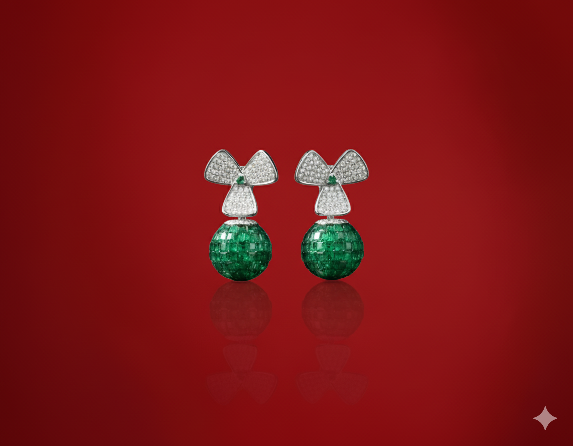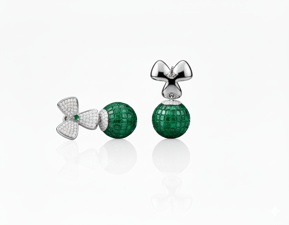 The focal point of each piece is a perfectly rounded emerald orb, meticulously crafted using an advanced invisible setting. This technique allows rows of precision-cut green emeralds to wrap around the sphere, creating a seamless surface of intense, velvety color. The orb hangs gracefully from a stylized fan-motif top, adorned with dense diamond pavé and a central emerald accent. The combination of shimmering white gold and vibrant green makes this a quintessential choice for the modern luxury collector.
