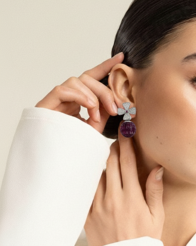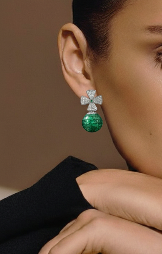 Define your signature style with our Emerald Orb & Diamond Fan Earrings. Designed for maximum visual impact, these drops combine geometric precision with a lavish display of precious gemstones.