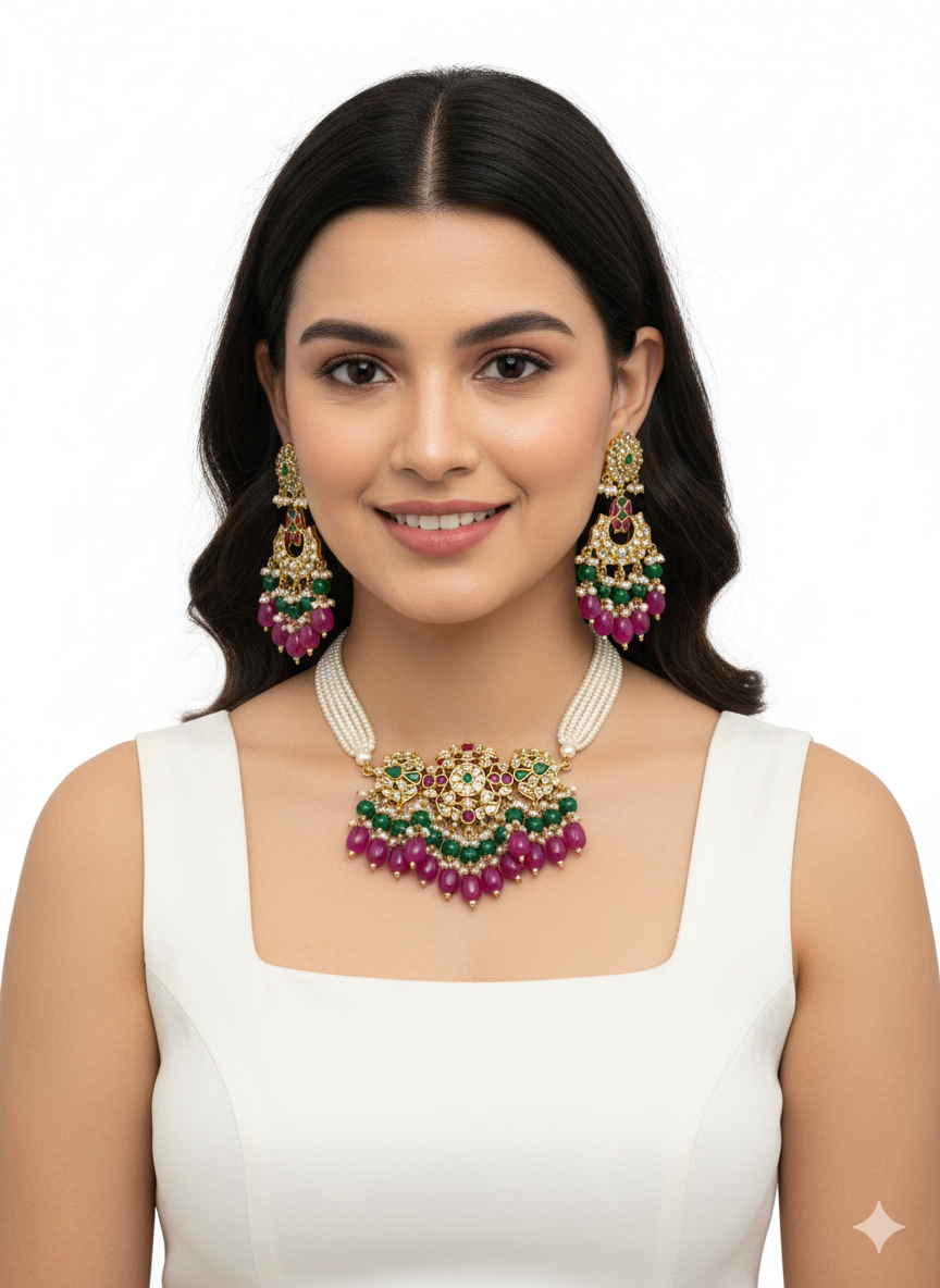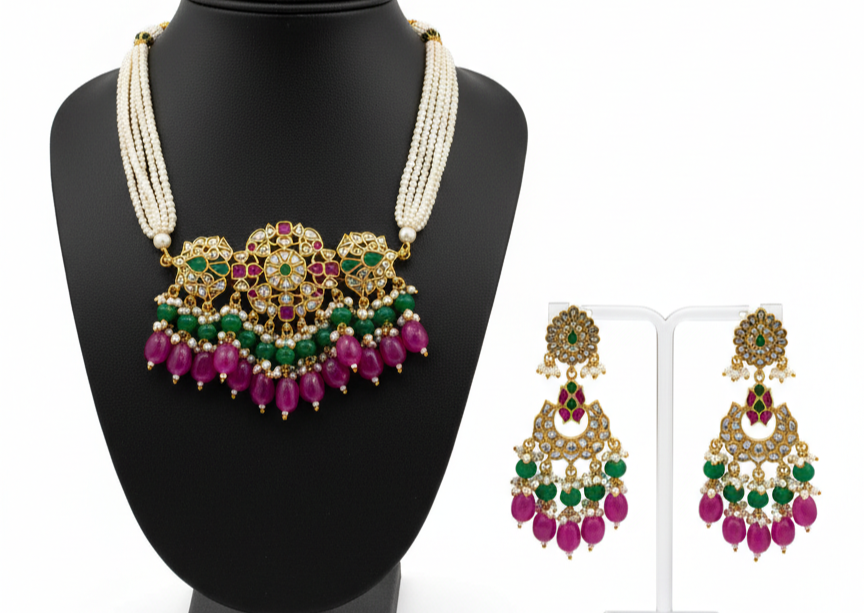 Bold, regal, and exquisitely detailed, this Royal Ruby & Emerald Pearl Statement Necklace Set is designed for unforgettable occasions. Featuring layered strands of luminous pearls, the necklace is adorned with an ornate centerpiece highlighted by ruby-toned and emerald-toned accents, shimmering stones, and intricate antique gold detailing. The cascading ruby-hued drops, paired with delicate green beadwork, add richness and graceful movement.