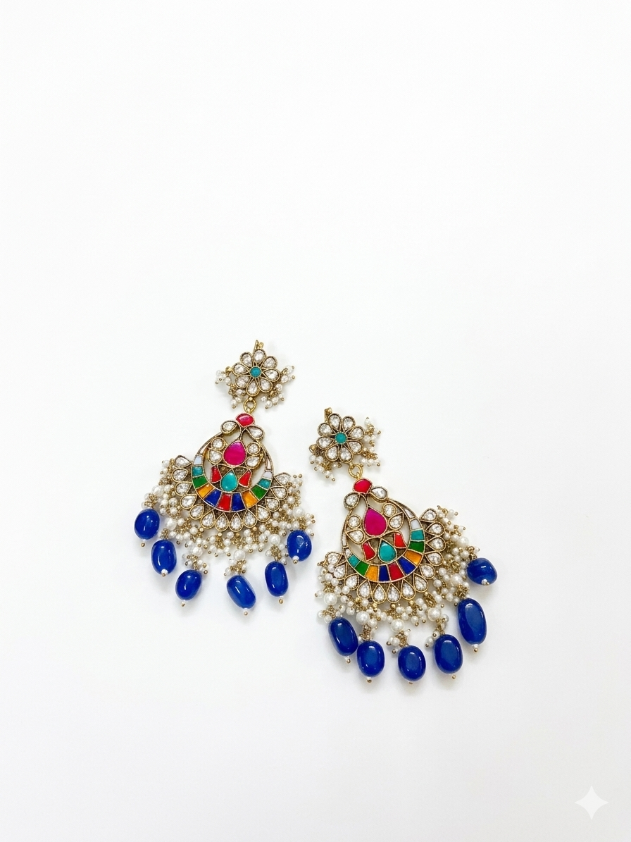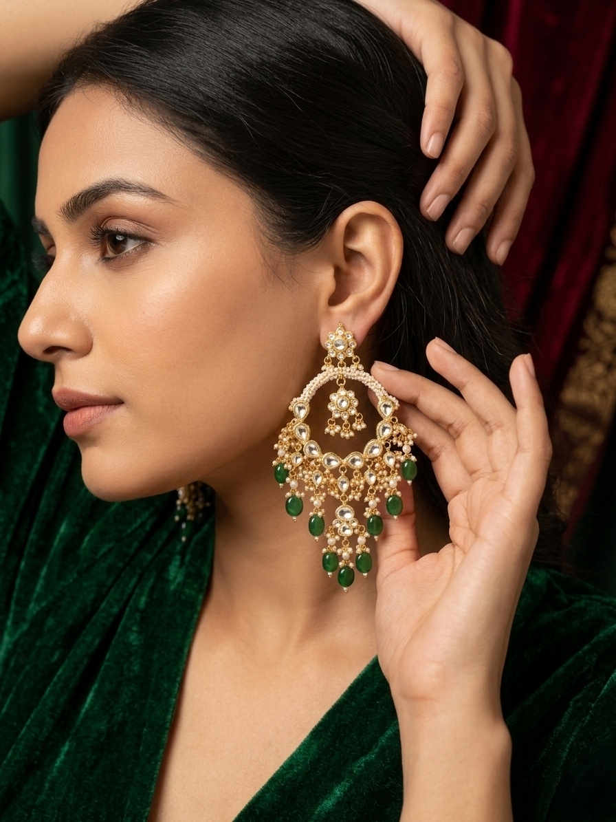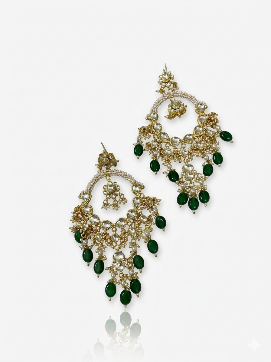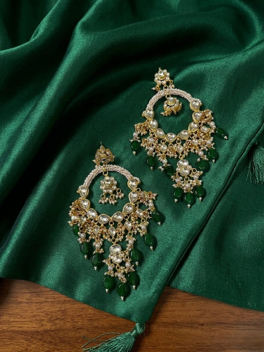 Elevate your ethnic wardrobe with these exquisite Chandbali earrings, a masterpiece of traditional craftsmanship. Featuring a classic crescent-moon silhouette, these earrings are intricately adorned with shimmering Polki (uncut diamonds) and delicate seed pearls. The design is further enriched by vibrant green emerald-style drops that dangle gracefully, adding a touch of regal sophistication. Crafted with a vintage gold-tone finish, these earrings perfectly capture the essence of heritage jewelry, making them a stunning choice for weddings, festive celebrations, or high-profile events.