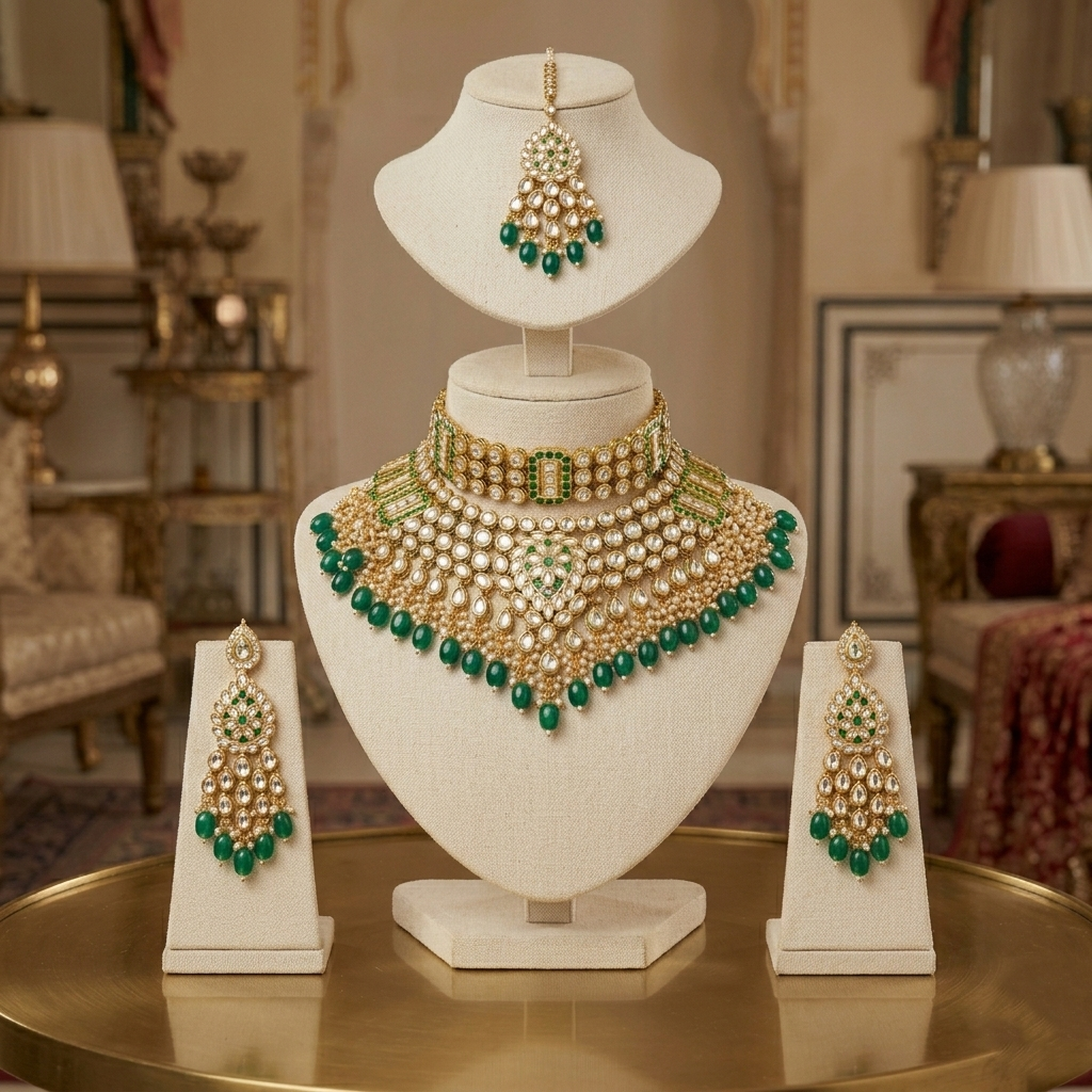 Make a regal statement with our Emerald Royale Kundan Bridal Choker Set, a breathtaking masterpiece crafted for grand celebrations. This opulent set features a richly detailed choker adorned with luminous kundan stones, delicate pearl accents, and deep emerald-green drops that exude timeless elegance.