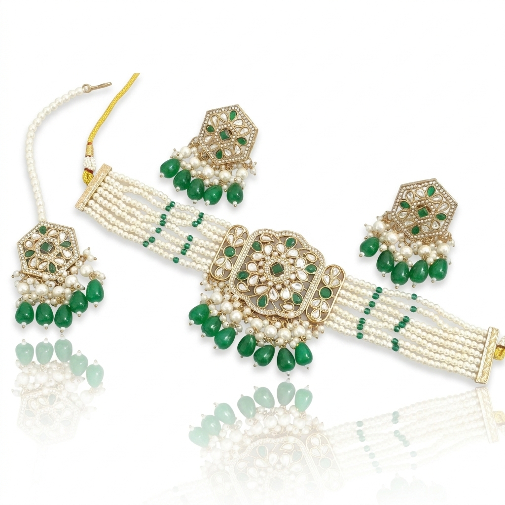 Elevate your elegance with this exquisite Emerald Royale Pearl Heritage Necklace Set, a timeless blend of traditional artistry and regal charm. Crafted with intricate gold-tone detailing, the set features multi-layered pearl strands beautifully complemented by rich emerald-green stones.