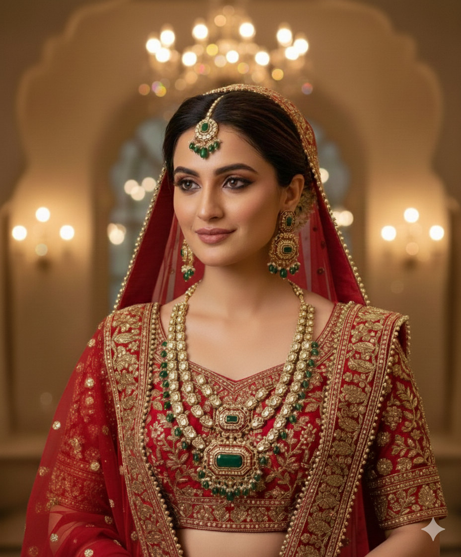 Grand layered bridal jewelry set with polki-style stones, emerald accents, and matching earrings for a regal traditional look.