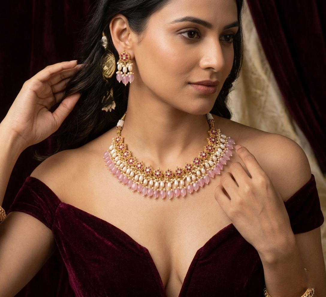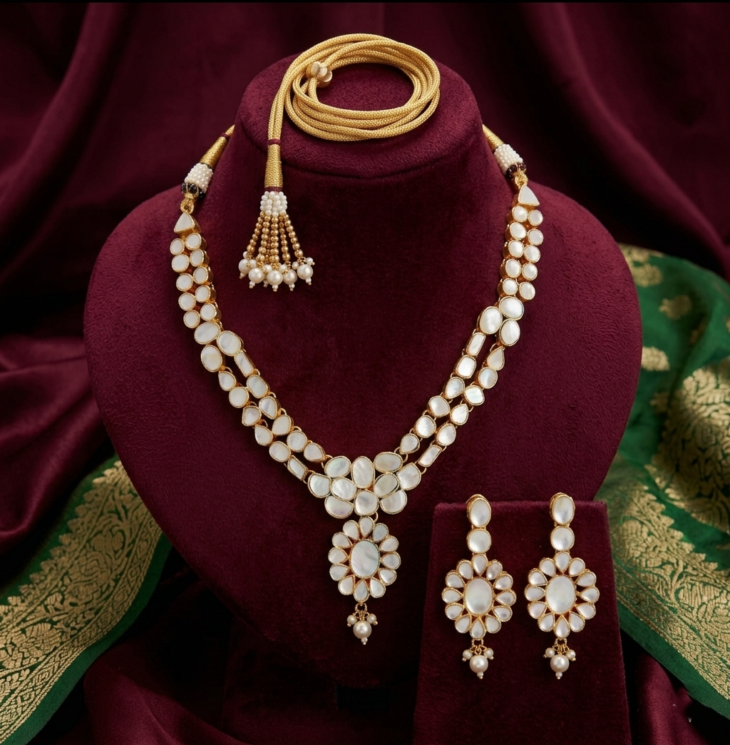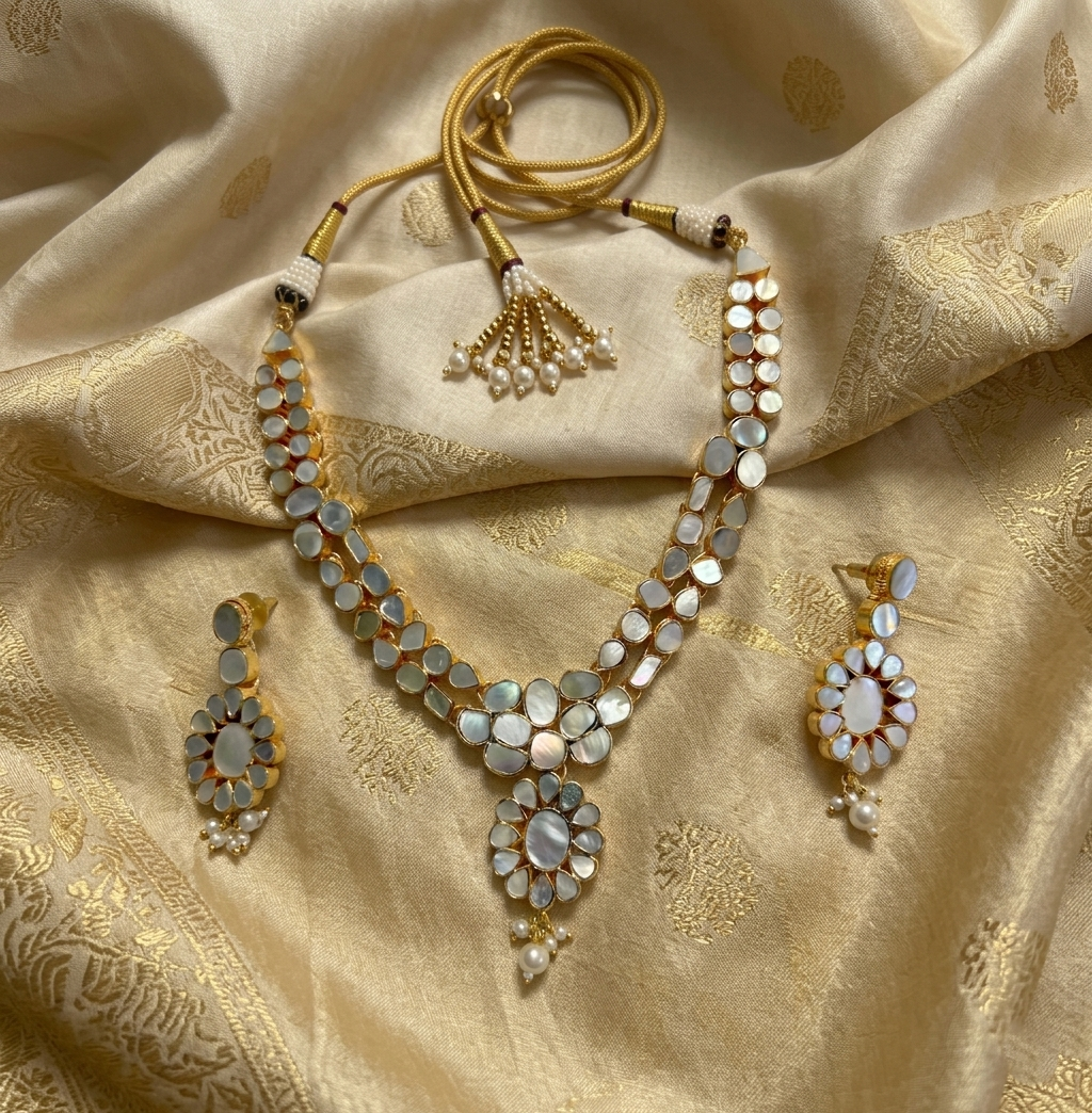 A refined gold-toned necklace featuring a double strand of luminous mother-of-pearl inlays and a striking floral-inspired pendant. Paired with matching floral drop earrings, this set offers a timeless, monochromatic elegance that complements any festive or formal ensemble.