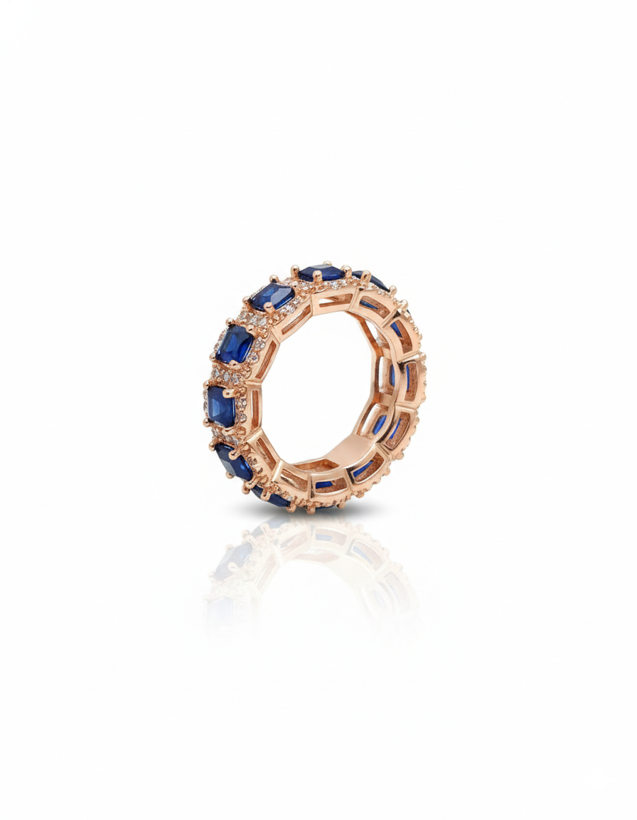 Discover a perfect fusion of modern luxury and timeless design with this sapphire-inspired eternity band. This striking piece features a continuous row of precision-set emerald-cut blue stones, each radiating a deep, regal hue. The band is meticulously crafted with a rich rose gold-tone finish, creating a warm and sophisticated contrast against the cool tones of the sapphire-style gems.