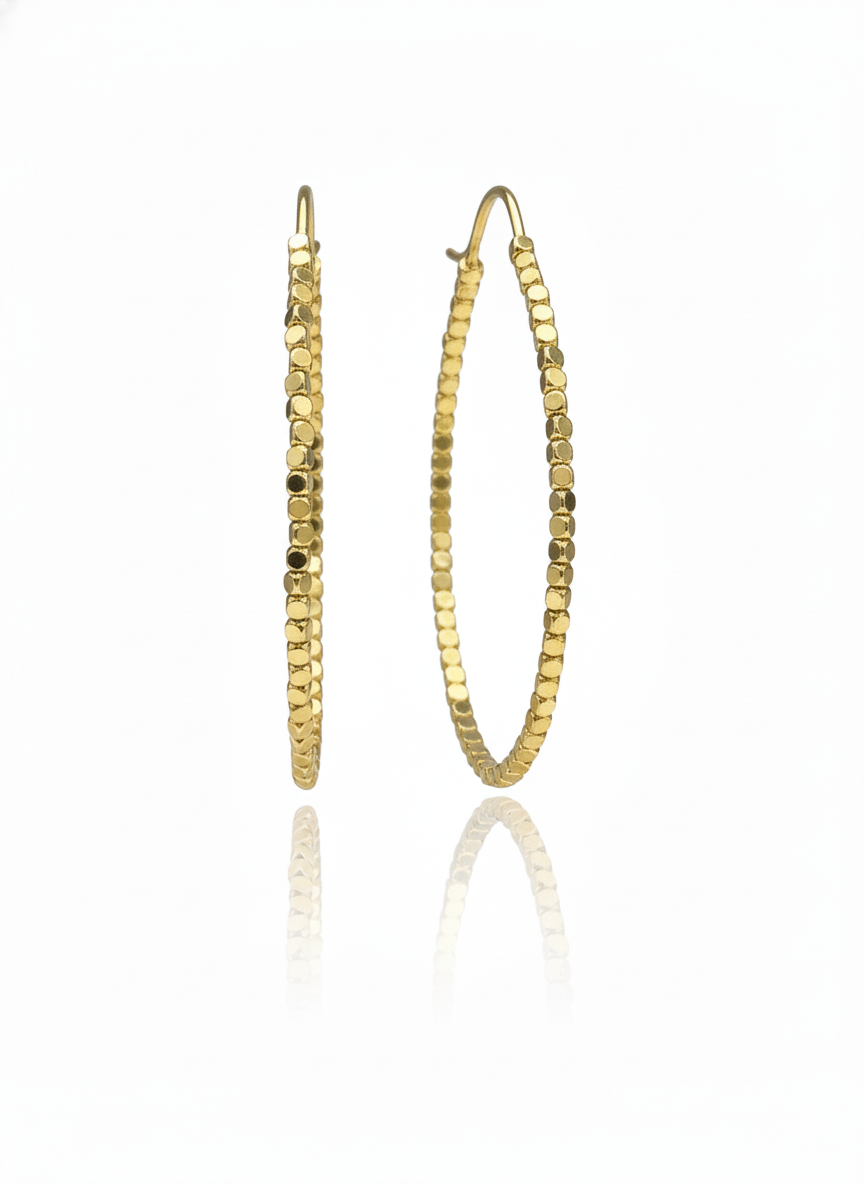 Design & Detail: Each hoop is meticulously crafted with rows of miniature gold-toned discs or beads, creating a “honeycomb” or “shimmer-link” effect. This intricate surface design ensures that the earrings glisten from every angle, providing a radiant glow that enhances all skin tones.