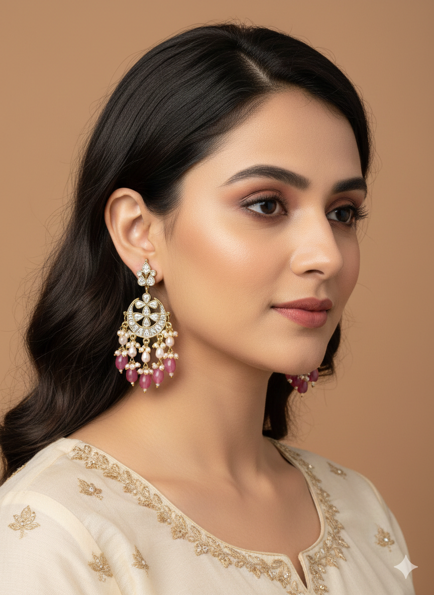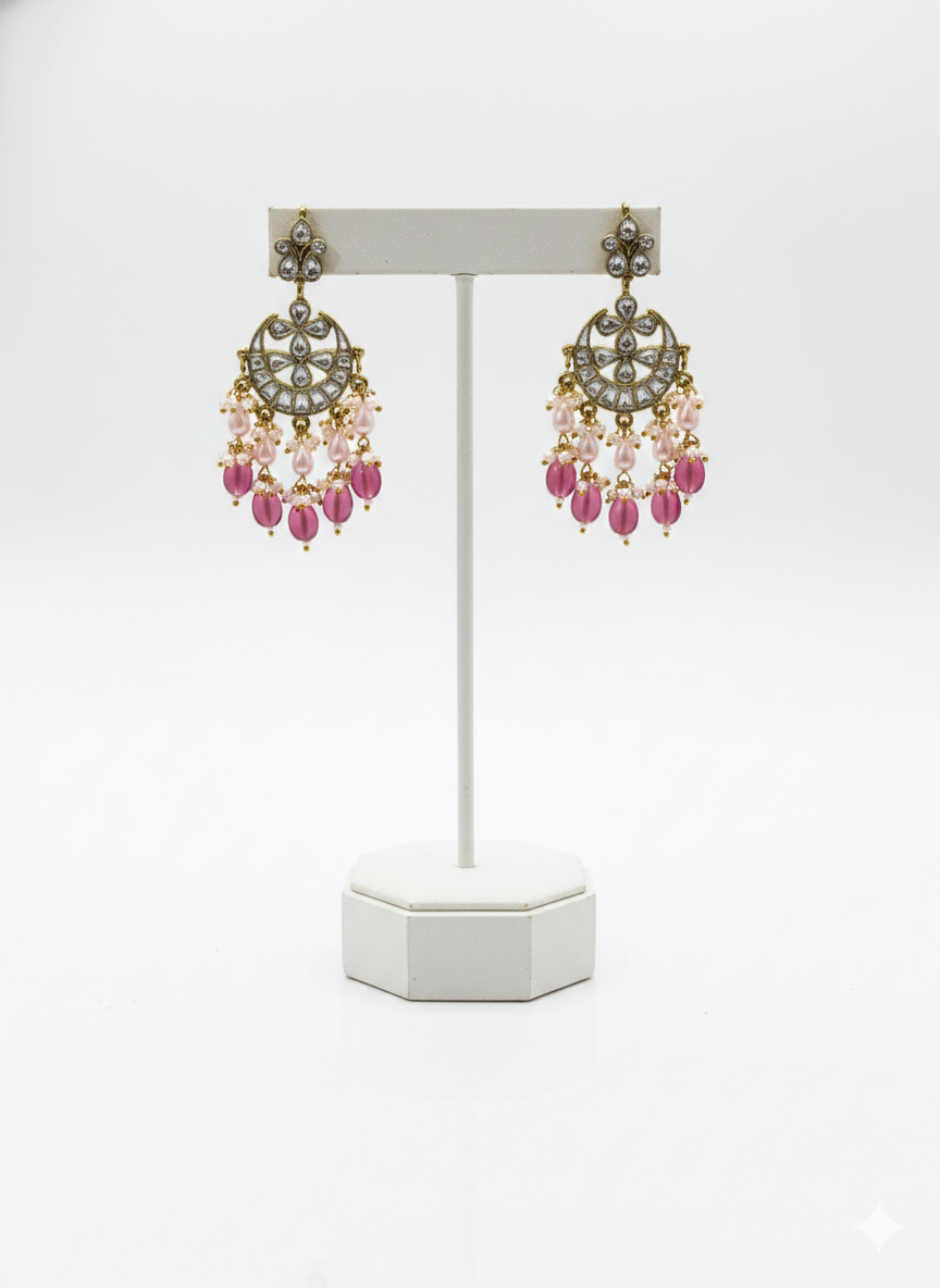Floral Kundan & Ombré Pink Bead Chandbali Earrings