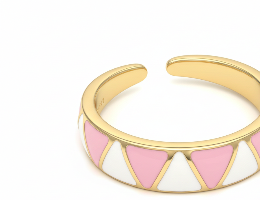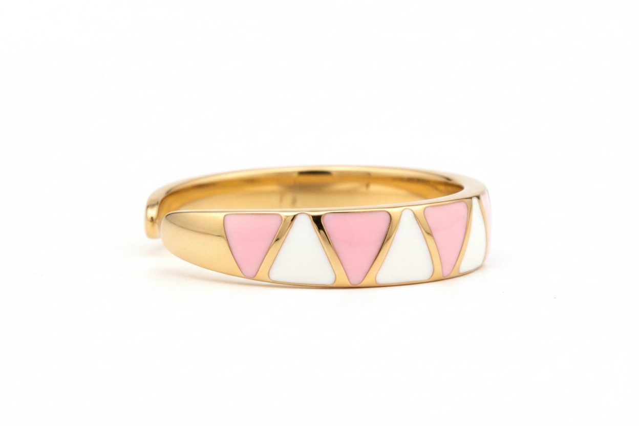 A chic and playful everyday essential, this gold-toned band features a modern geometric mosaic of soft pink and crisp white enamel. Its sleek, tapered profile and vibrant color-blocking make it the perfect piece for stacking or wearing as a minimalist statement.
