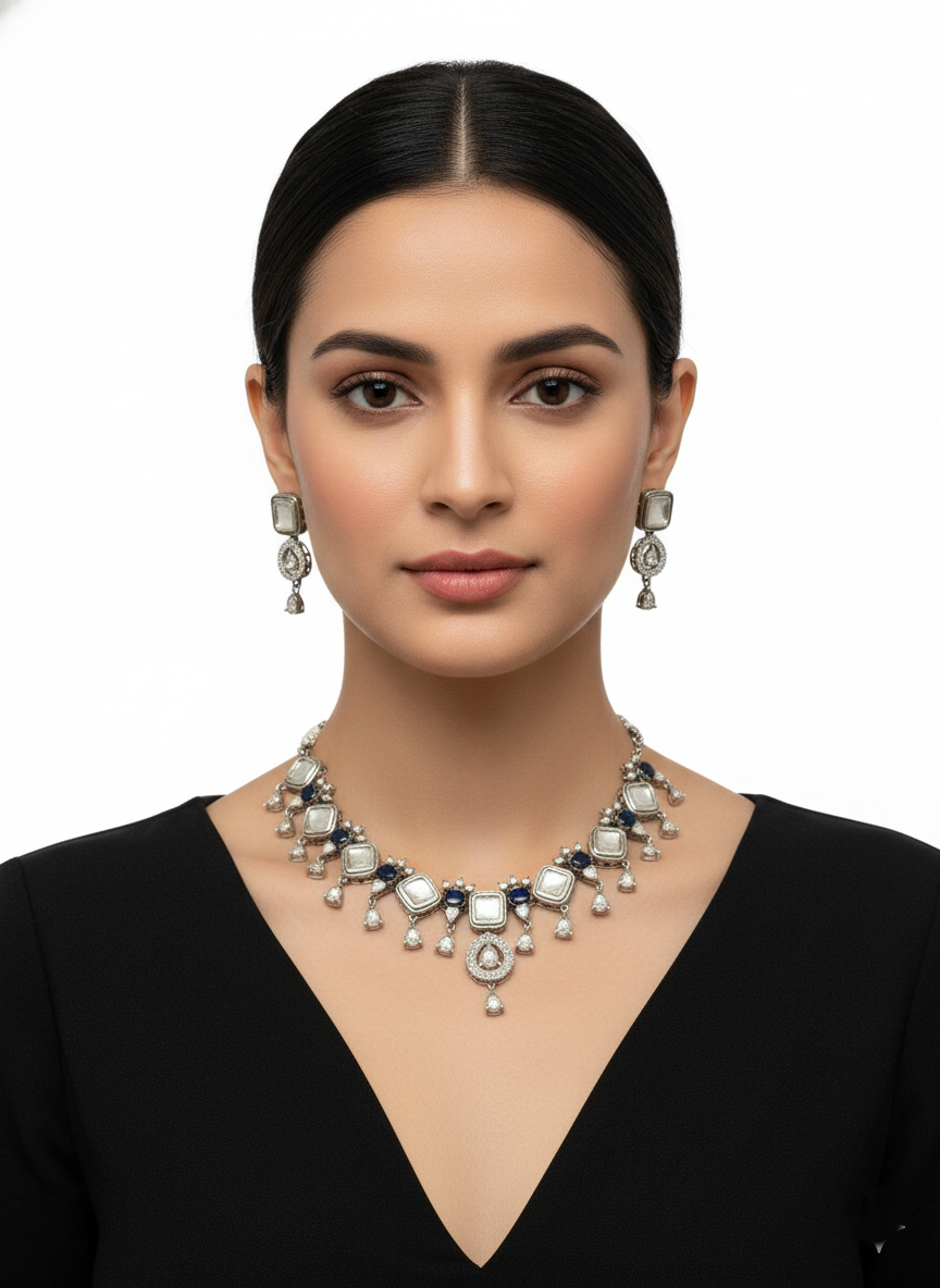 Command the spotlight with the Emerald Empress Set, a jewelry suite designed to celebrate high-end craftsmanship. The necklace features a structured collar of alternating square and circular medallions, each meticulously bordered with shimmering micro-crystals that provide a crisp, radiant contrast.