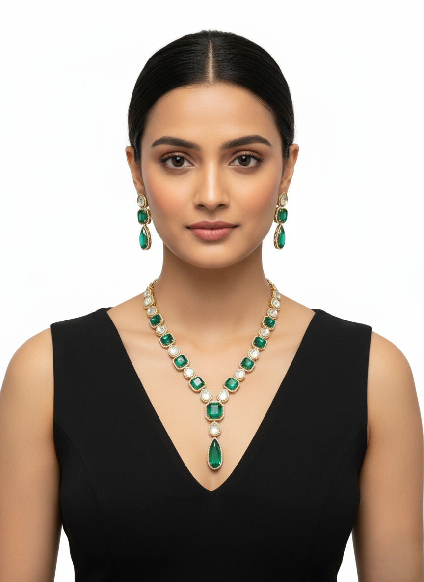 The centerpiece of the design is a series of captivating teardrop-shaped emerald-tone stones that drape elegantly along the neckline, each suspended within a brilliant-cut pavé frame. The set is completed with matching tiered earrings that mirror the geometric motifs of the necklace, creating a balanced and powerful silhouette. Crafted for grand wedding receptions and imperial-themed celebrations, this suite offers a timeless aesthetic with a bold, contemporary edge.