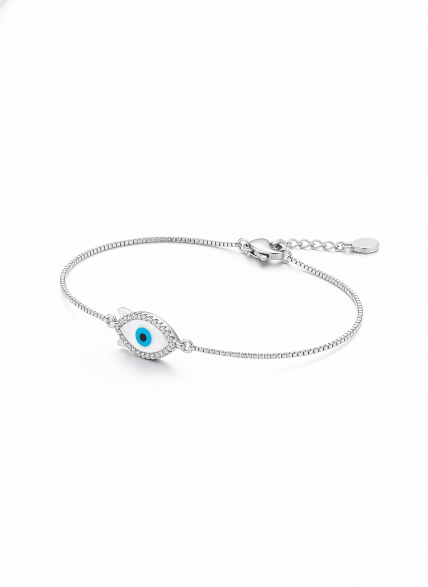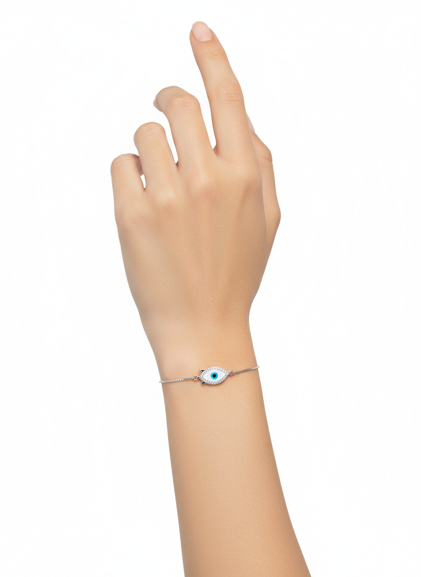 This elegant adjustable bracelet centers on a beautifully detailed Hamsa Hand, a universal sign of protection and good fortune. The palm is inlaid with a custom-cut slice of genuine Mother-of-Pearl, which provides a soft, luminous glow that changes with the light. At its center sits a concentrated Evil Eye motif in sapphire blue and white, designed to ward off negativity.