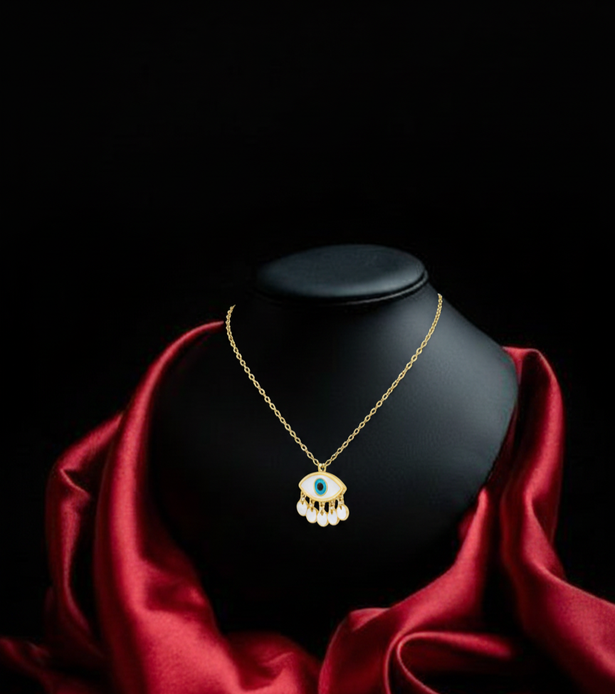 This striking necklace blends traditional symbolism with a playful, modern aesthetic. Crafted with a high-polish gold finish, the centerpiece features a classic Evil Eye motif with a vibrant blue pupil set against a clean white backdrop. Adding a touch of movement, five delicate, round white charms dangle from the base of the eye, creating a rhythmic chandelier effect. The pendant is suspended from a fine cable chain that includes an adjustable extender and a secure lobster clasp. Perfect for layering or wearing as a standalone protective talisman, this piece adds a unique bohemian flair to any outfit.