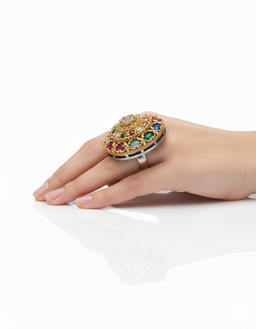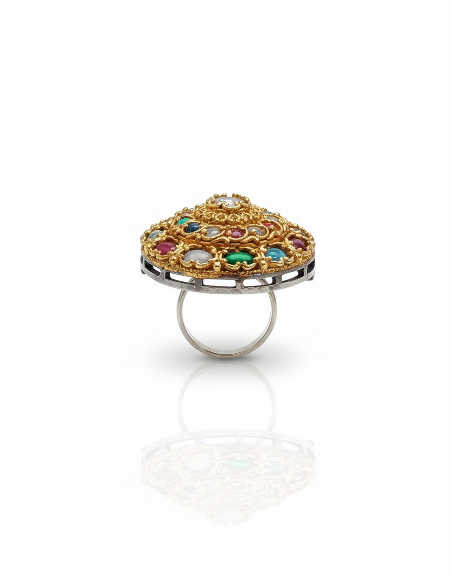 A majestic multi-stone dome ring featuring a vibrant array of Navratna-inspired gems set in an intricate gold-plated filigree design. Handcrafted for a royal look, this statement piece is perfect for weddings and traditional festivities.