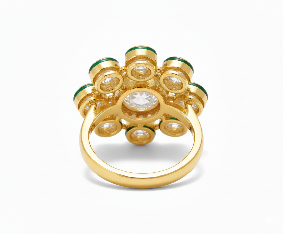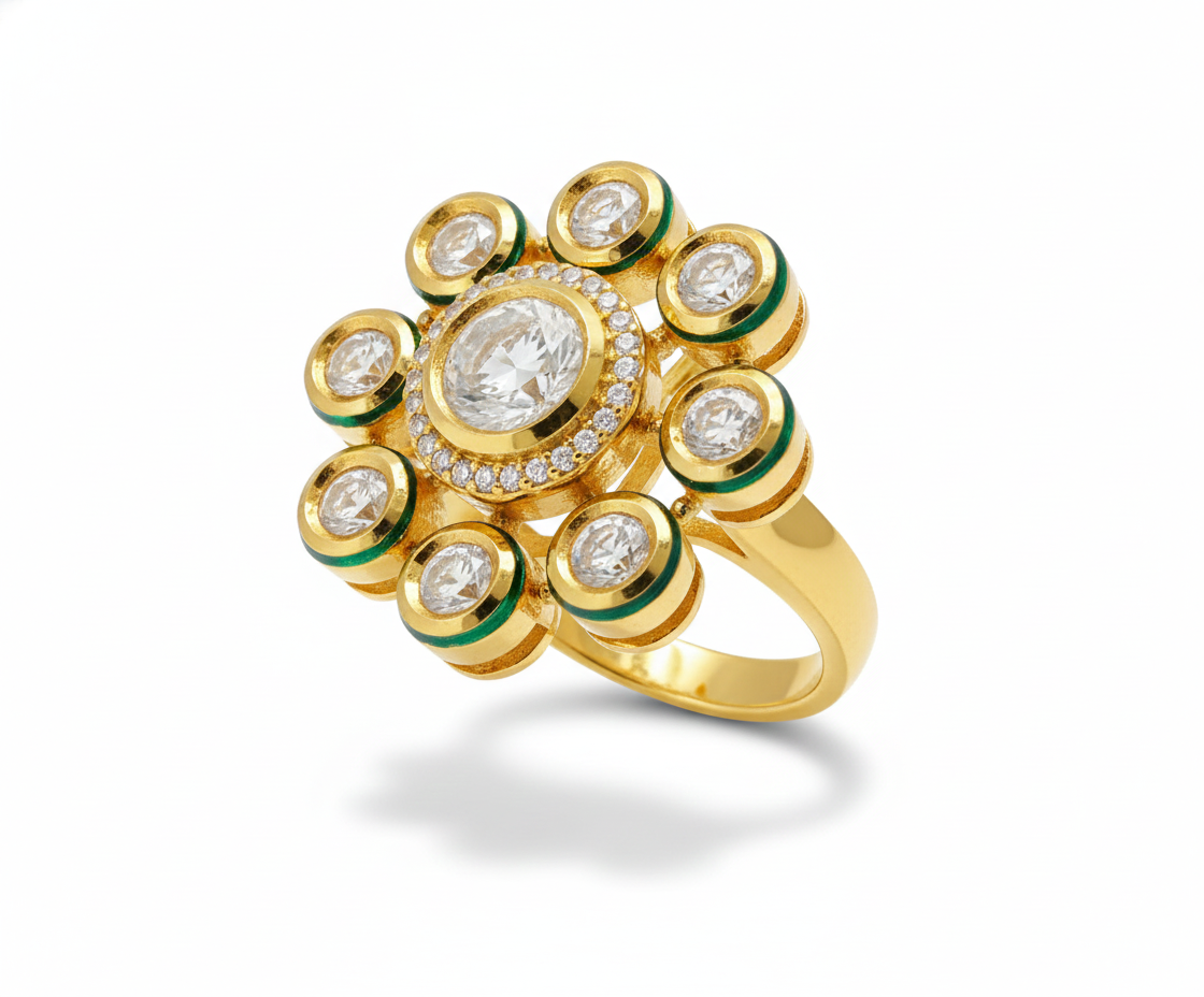 A majestic Polki floral ring featuring a central uncut stone, micro-crystal detailing, and vibrant green Meenakari edging. Handcrafted in premium gold finish, this statement piece is designed to bring a regal charm to any ethnic or fusion ensemble