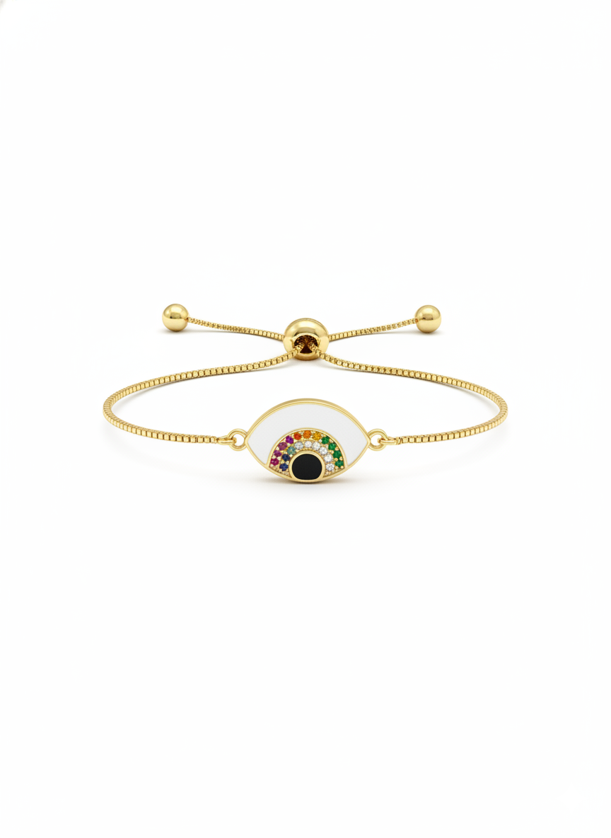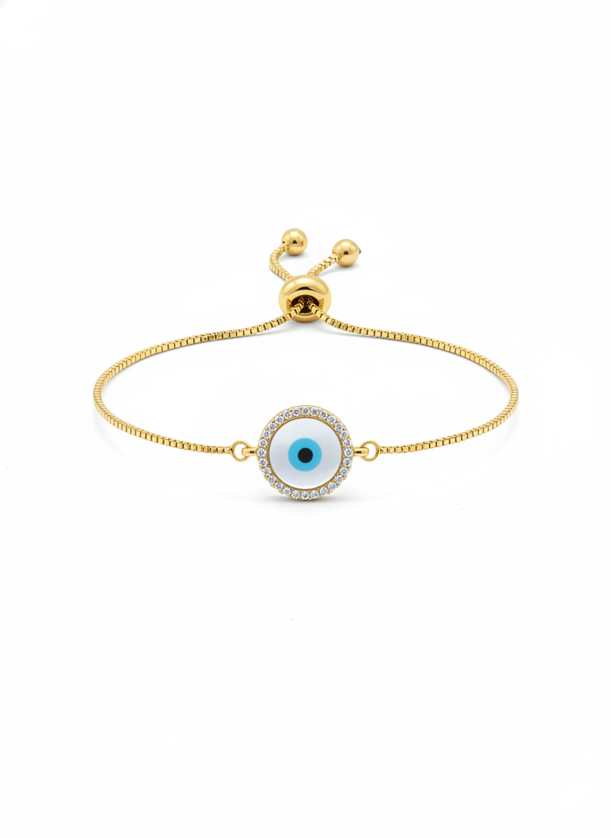 Elevate your everyday look with this elegant Gold Round Evil Eye Adjustable Bracelet. Designed with a delicate gold-tone chain, this bracelet features a striking round evil eye centerpiece framed by shimmering stones and a vibrant blue accent. The adjustable slider closure ensures a secure and comfortable fit for any wrist size