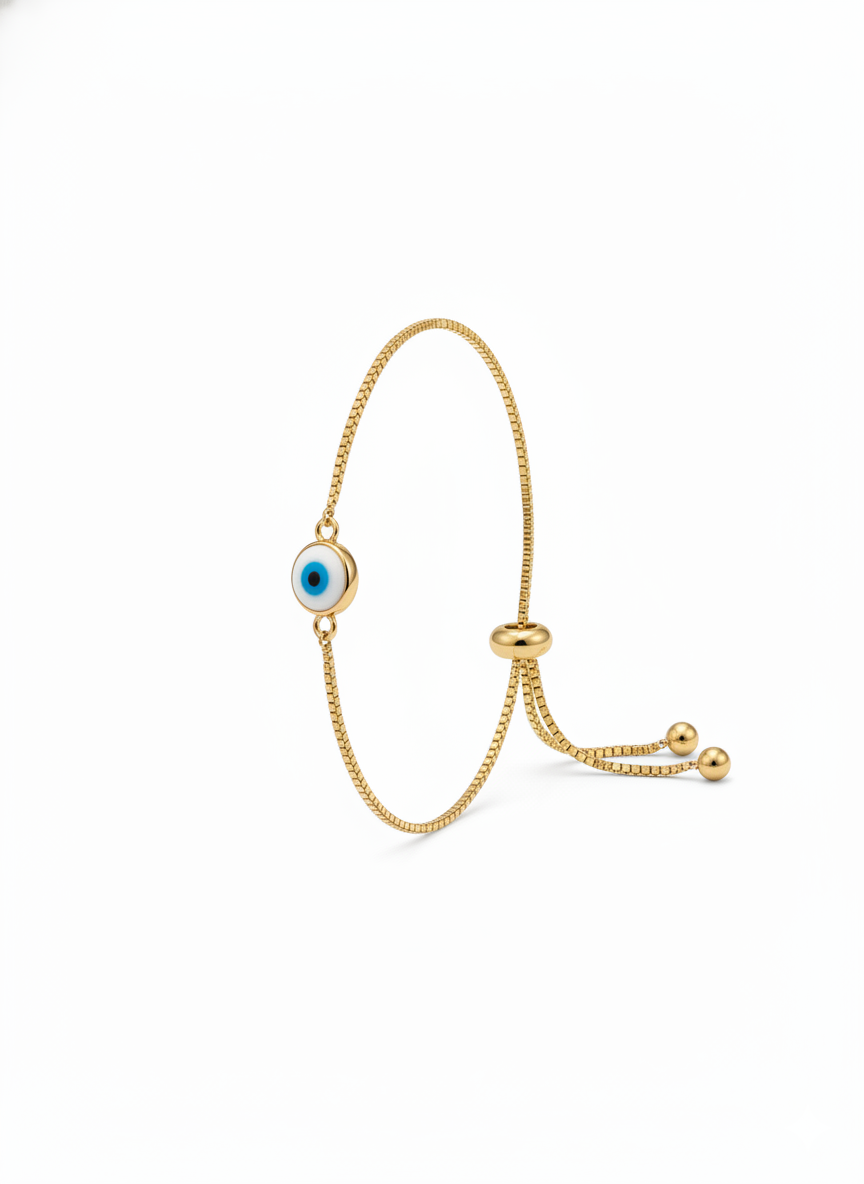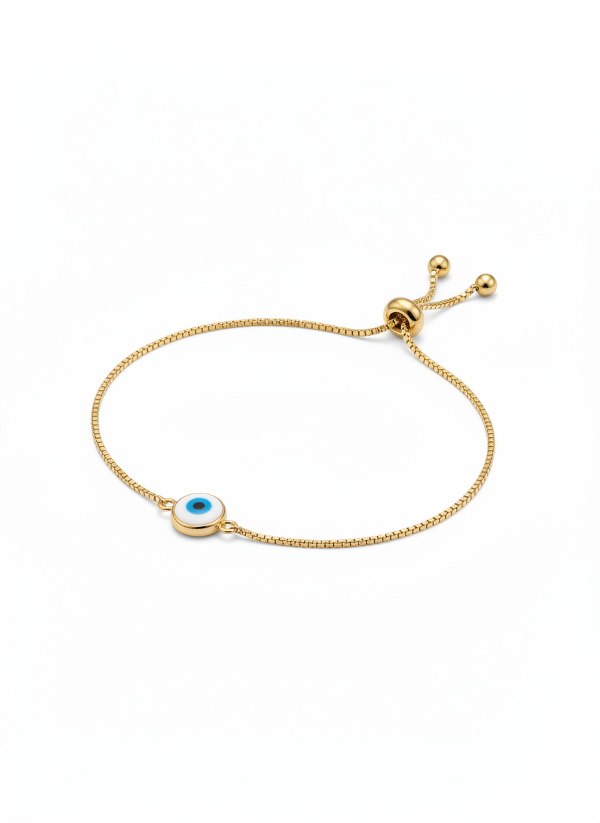 A minimalist symbol of protection and style, this 18K yellow gold-tone bolo bracelet features a classic Evil Eye charm. The vibrant blue and white enamel eye is set in a polished gold frame and paired with a sleek box chain for a modern, adjustable fit.