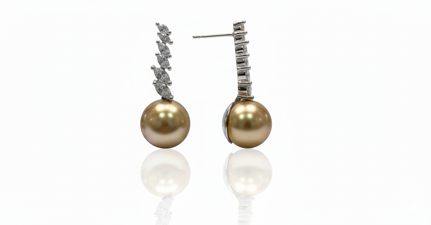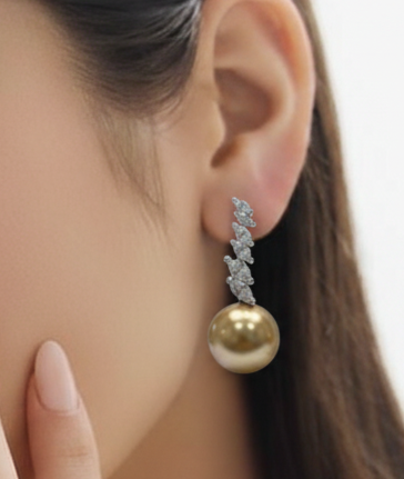 These exquisite drop earrings showcase the natural beauty of radiant golden pearls, celebrated for their rare warmth and soft, glowing luster. Each pearl is delicately suspended from a refined line of brilliant diamond accents, creating a graceful vertical silhouette that elongates and flatters.