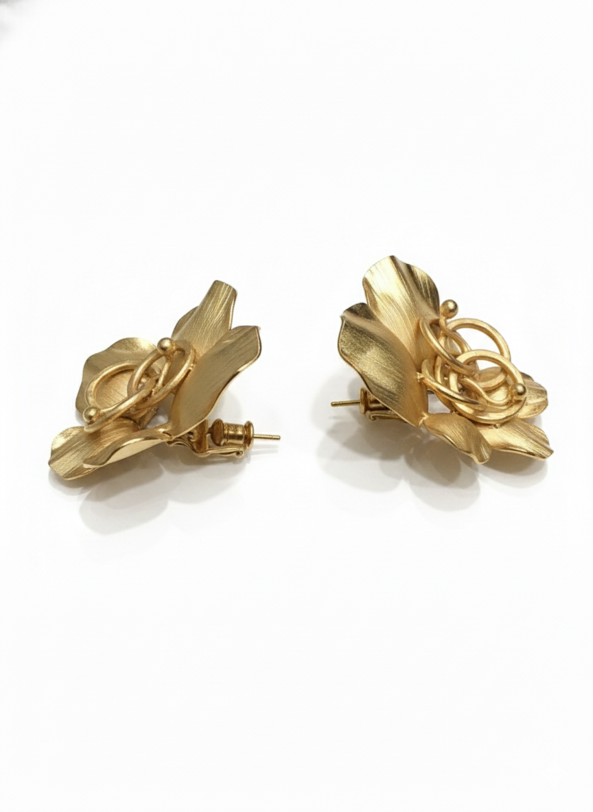 Elegant gold-finish floral stud earrings featuring a handcrafted petal design with a soft matte texture, perfect for classy everyday and occasion wear.