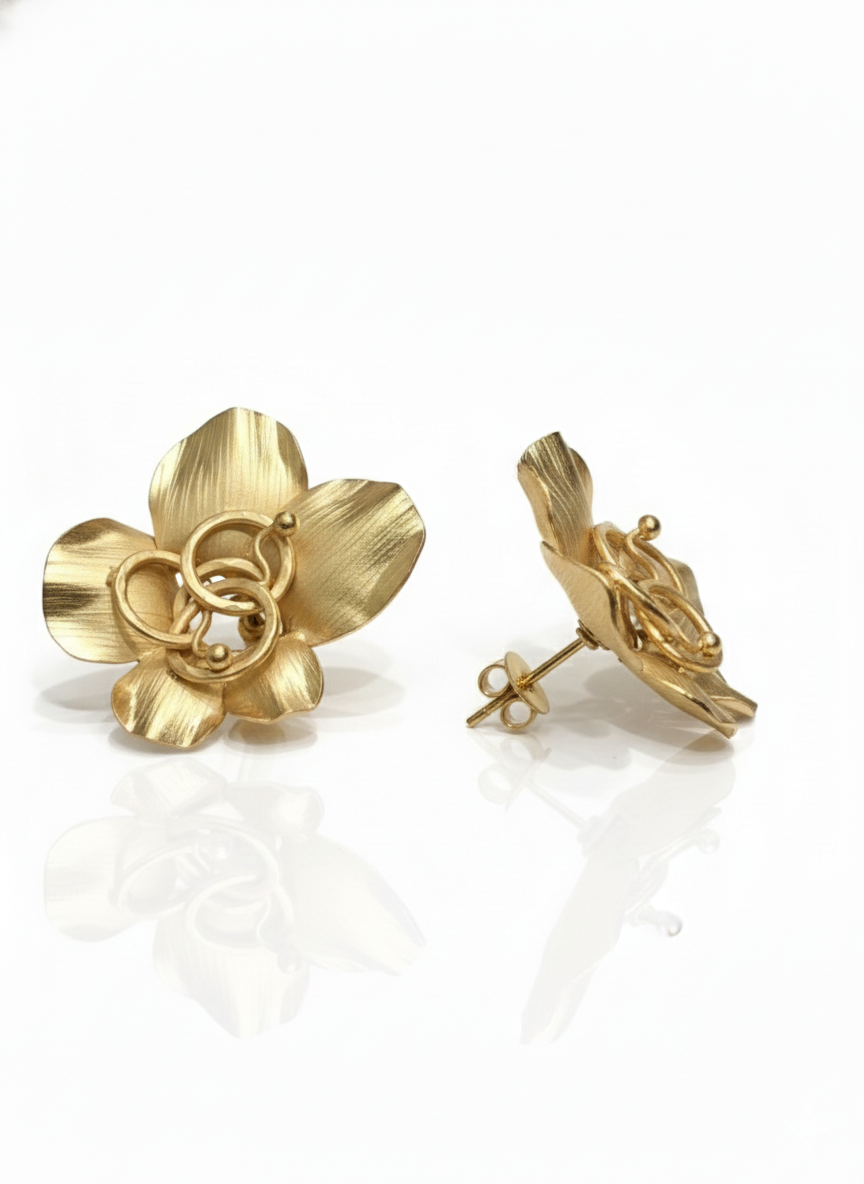 These beautifully crafted gold finish floral stud earrings showcase an artistic flower design with layered petals and a refined matte brushed texture. The intricate handcrafted detailing gives the earrings a rich, premium look while maintaining a lightweight and comfortable feel. Designed as statement studs, they add a touch of elegance and sophistication to both ethnic and western outfits. Ideal for parties, festive occasions, weddings, or daily wear, these earrings are perfect for women who love bold yet graceful jewelry. A timeless accessory and a great gifting choice for birthdays, anniversaries, and celebrations.
