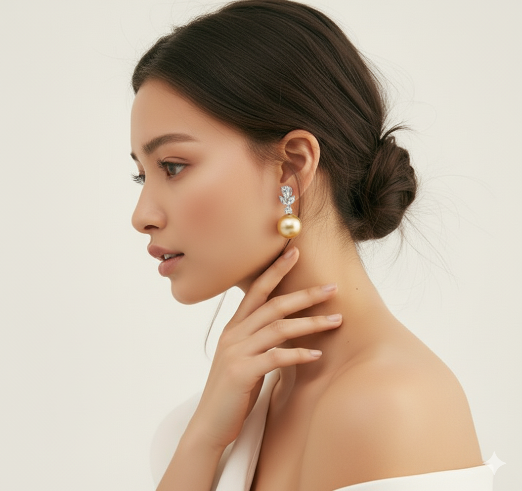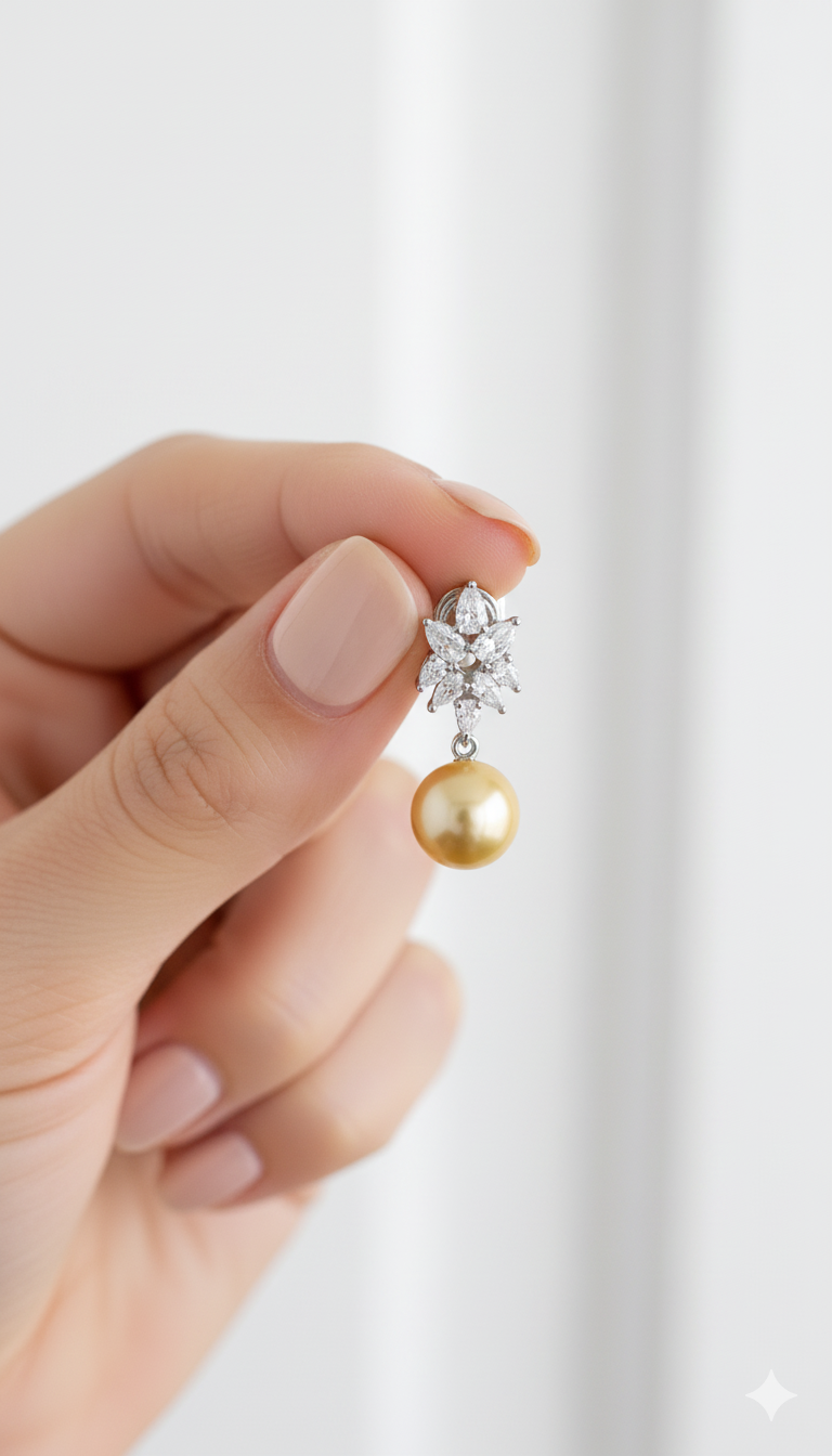 Indulge in the ultimate expression of luxury with these breathtaking Golden South Sea Pearl Drop Earrings. At the heart of each piece is a magnificent, high-luster golden pearl, renowned for its rich, warm glow and perfectly spherical form. The pearl is elegantly suspended from a radiant cluster of high-quality marquise and round brilliant-cut stones, arranged in a sophisticated floral-inspired motif. Set in a polished silver-finish mounting, the cool metallic tones perfectly accentuate the deep gold of the pearls. These statement earrings offer a regal and timeless aesthetic, making them the perfect choice for bridal wear, red-carpet events, or grand evening celebrations.