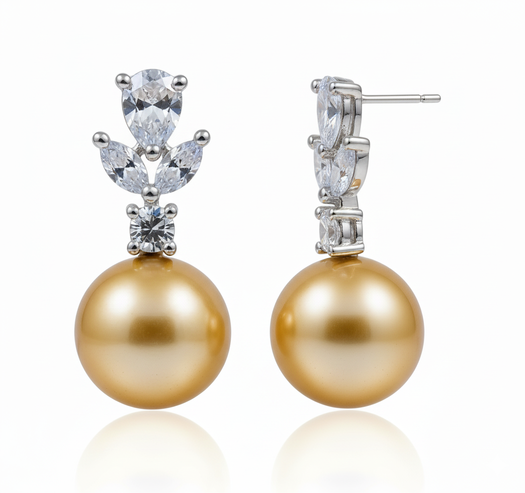 Majestic Golden South Sea pearl drop earrings featuring a brilliant cluster of marquise and round-cut stones. A luxurious silver-finish design that combines timeless pearl elegance with high-end modern brilliance.
