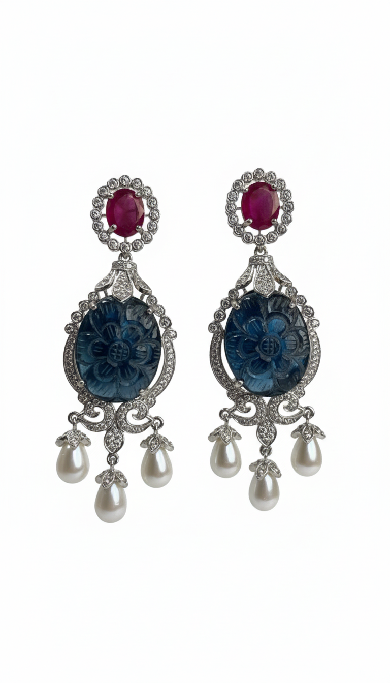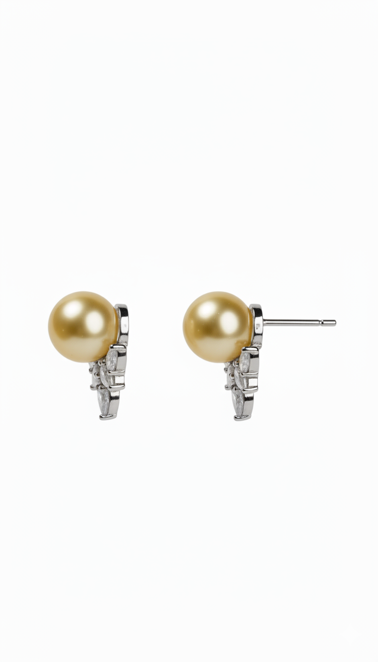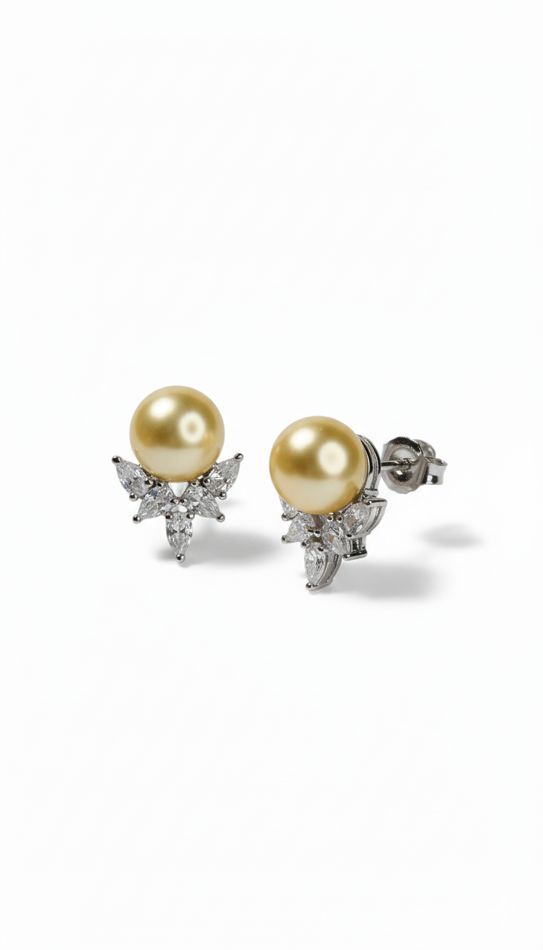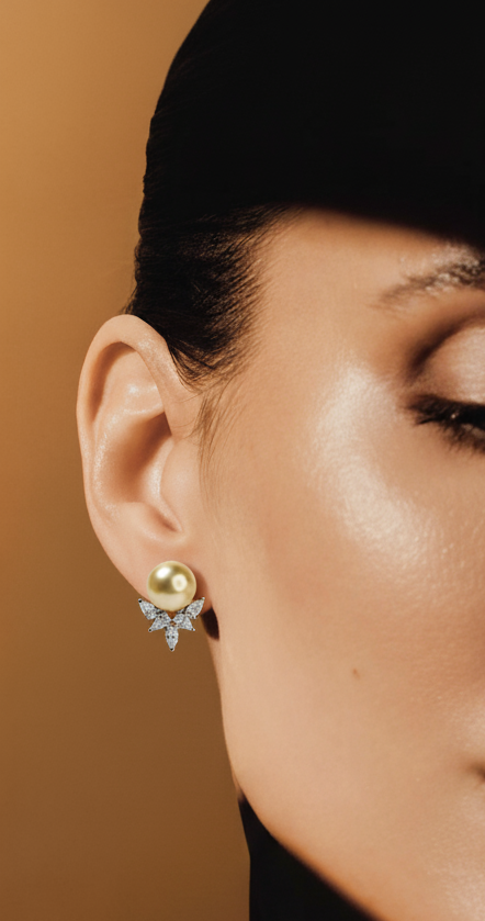 Elegant golden pearl stud earrings accented by a radiant cluster of shimmering marquise diamonds. A luxurious statement piece that combines timeless pearl grace with contemporary diamond brilliance.