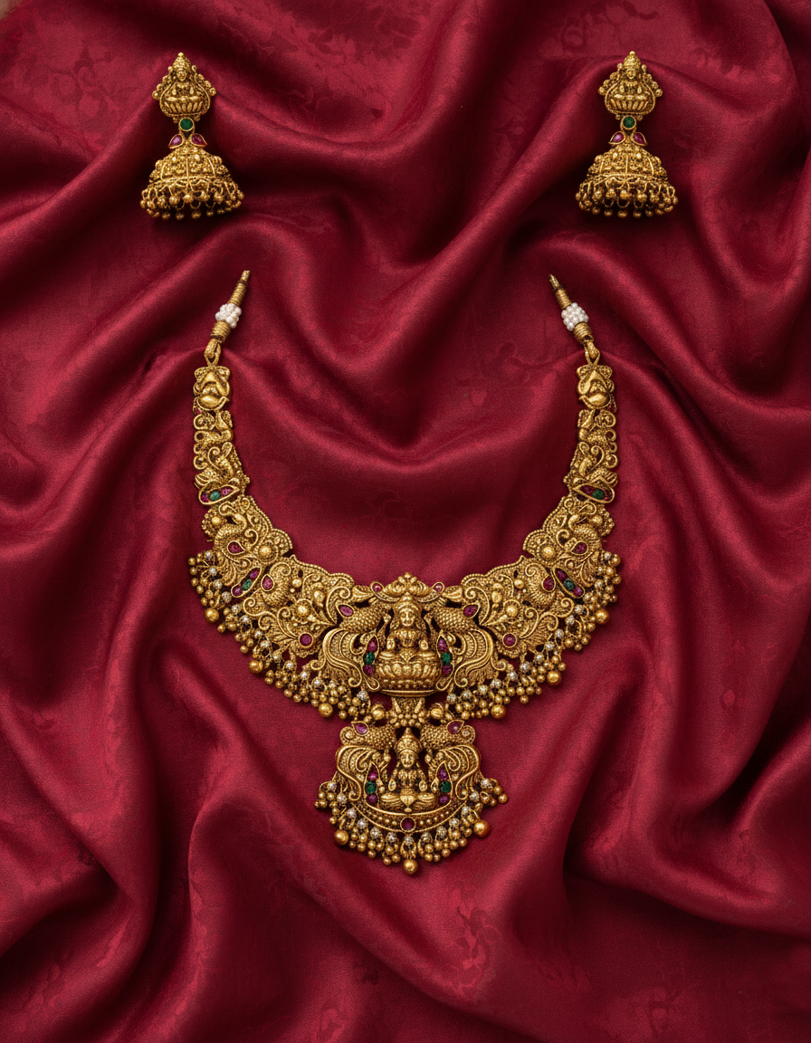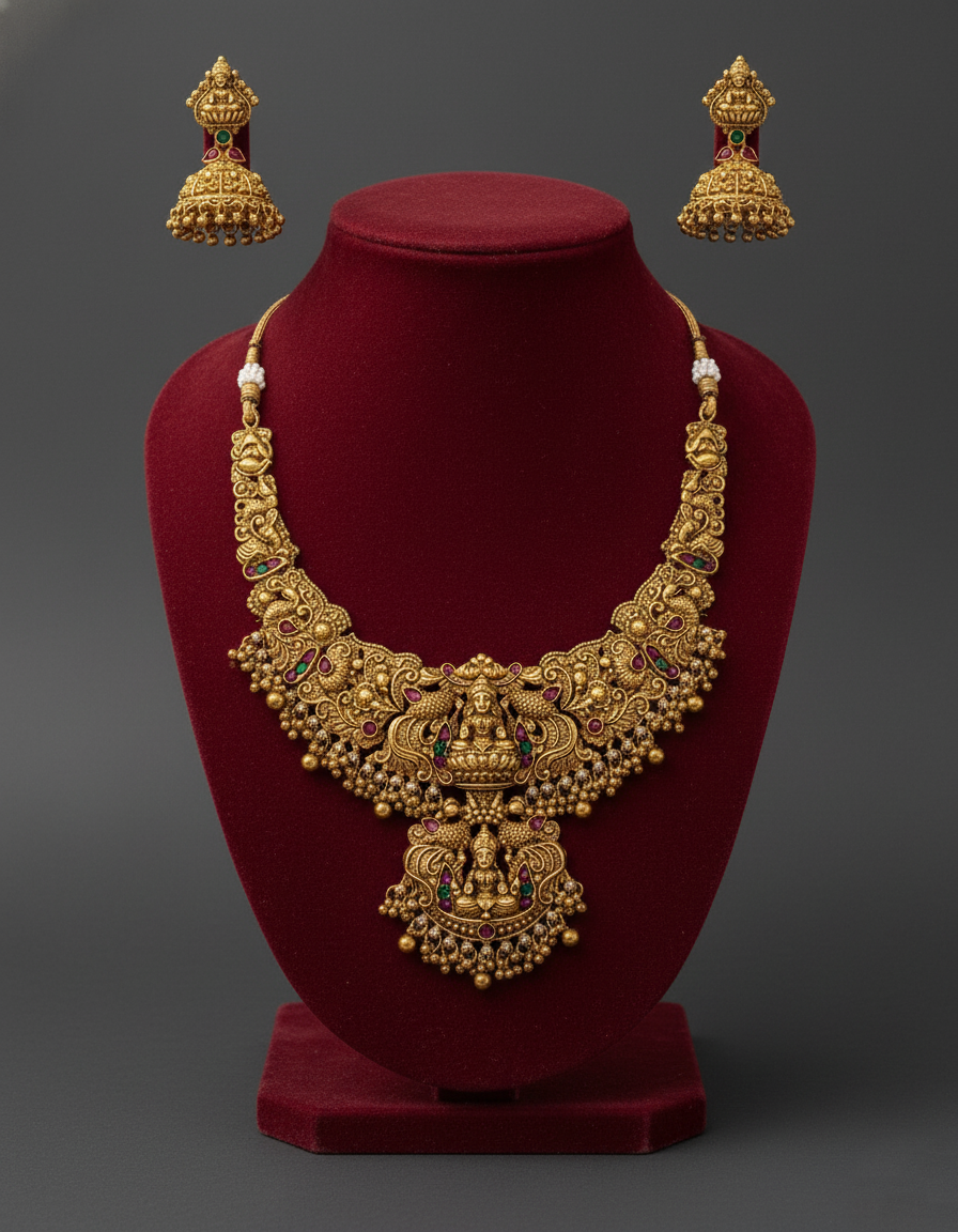 A regal antique-gold plated necklace set featuring a majestic tiered Goddess Lakshmi pendant and traditional Jhumkas. Intricately carved with peacock motifs and accented with classic ruby and emerald-toned stones.