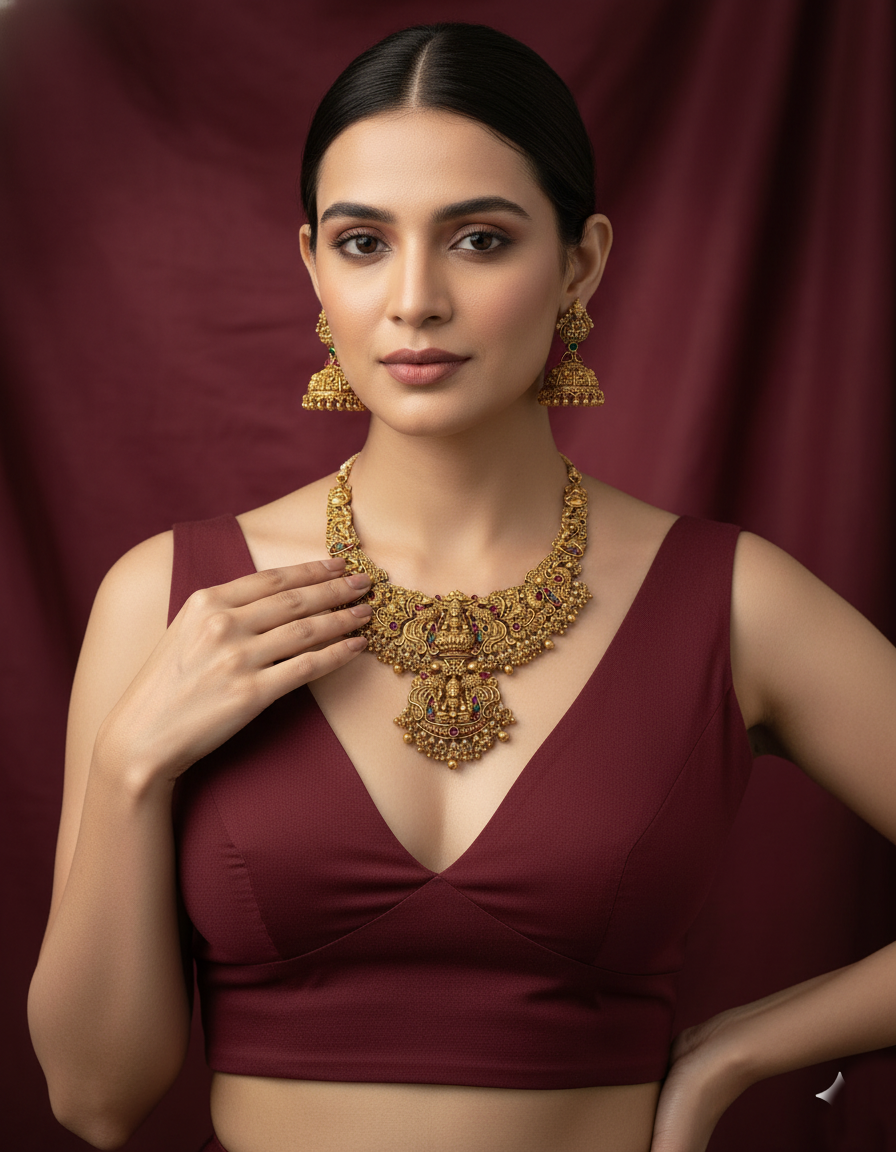 Radiate divine grace with this opulent Nakshi-work Temple Jewellery set. Designed for the bride or the festive connoisseur, this necklace features a unique double-pendant design showcasing Goddess Lakshmi seated in her traditional pose. The body of the necklace is a rich tapestry of peacock and floral filigree, meticulously crafted to mirror ancient temple carvings.