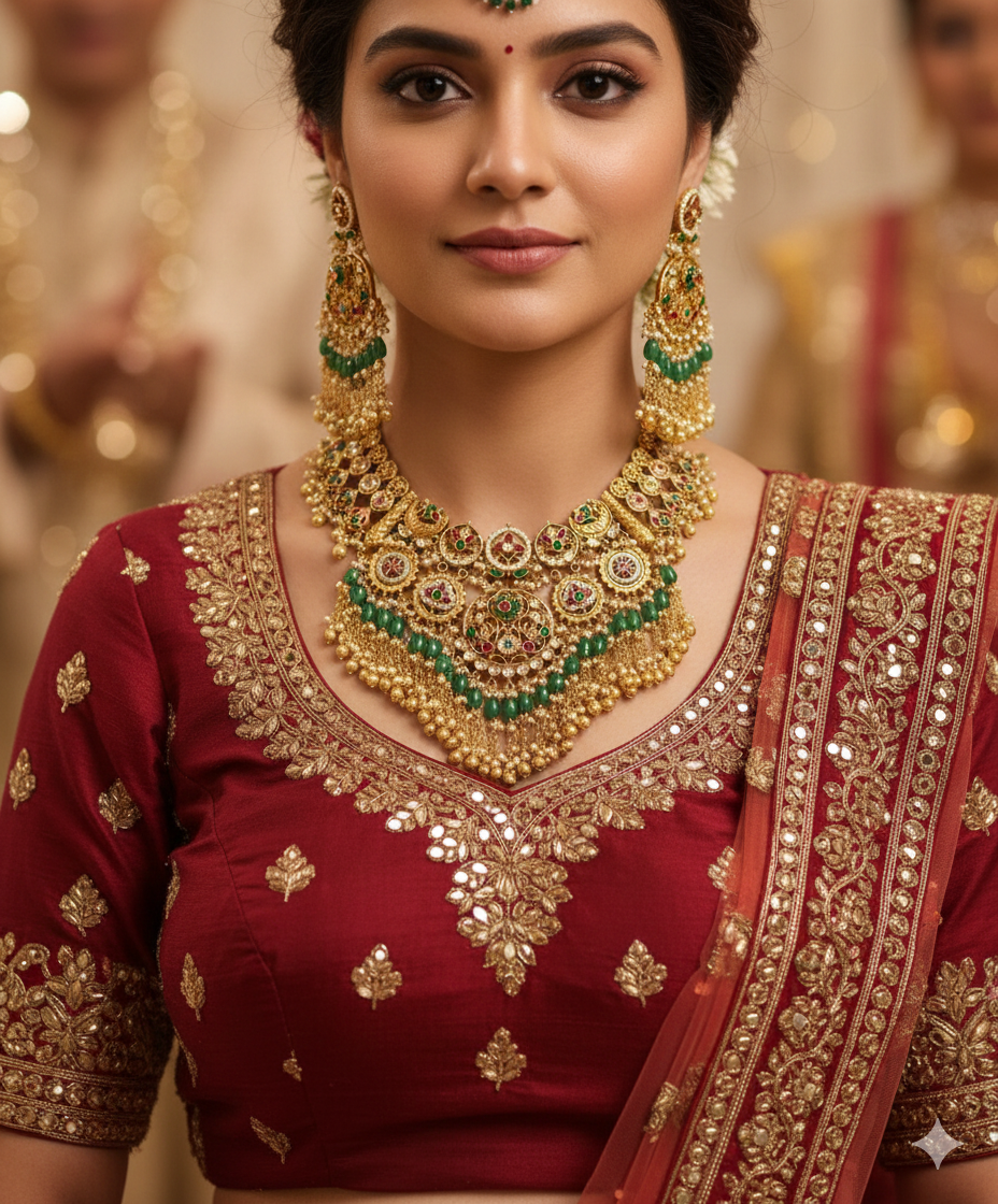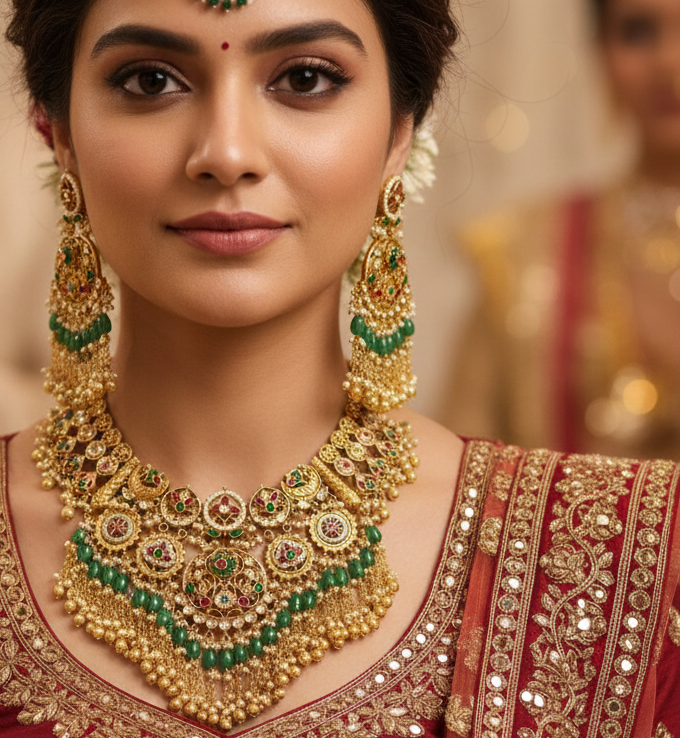 A grand Jadau-inspired jewelry set featuring an ornate filigree choker and matching heavy drop earrings. Finished with vibrant green emerald beads and a shimmering gold fringe, this ensemble is a stunning tribute to traditional craftsmanship and bridal luxury.