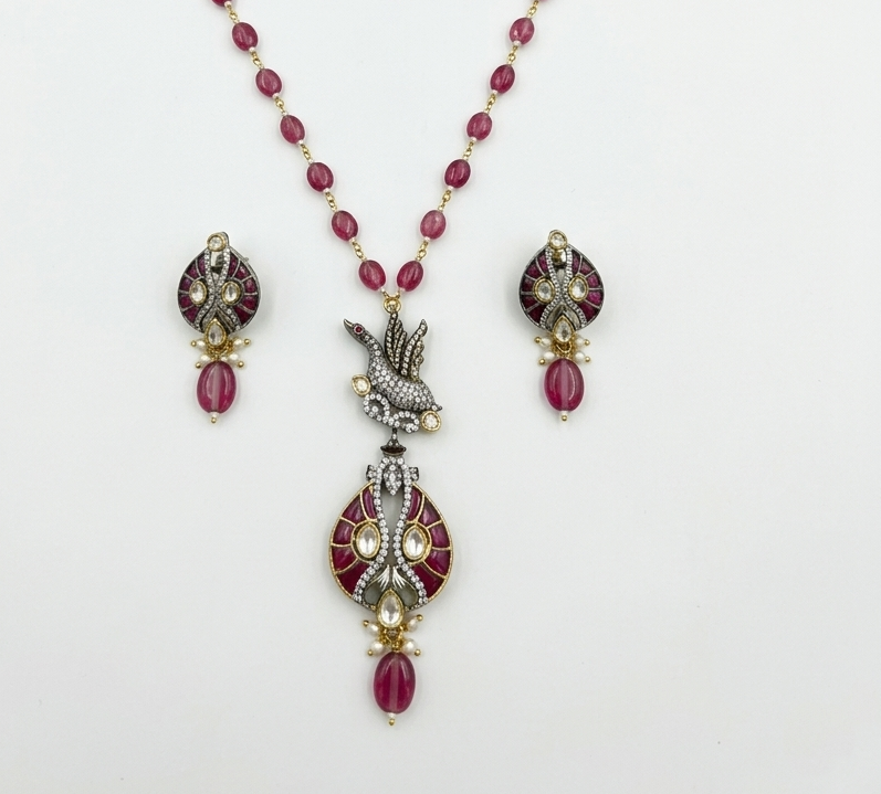An enchanting jewelry set featuring a hand-strung strand of ruby-red beads, a crystal-encrusted bird pendant, and a grand geometric drop, paired with matching statement earrings for a regal, antique finish.