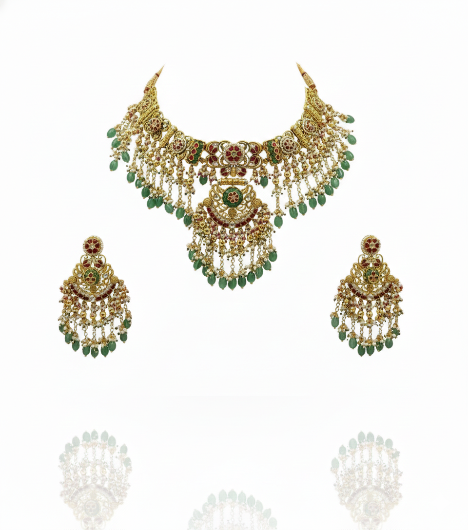 A regal meenakari bridal choker set featuring intricate floral motifs, cascading pearl detailing, and emerald-green bead drops, paired with matching statement earrings.