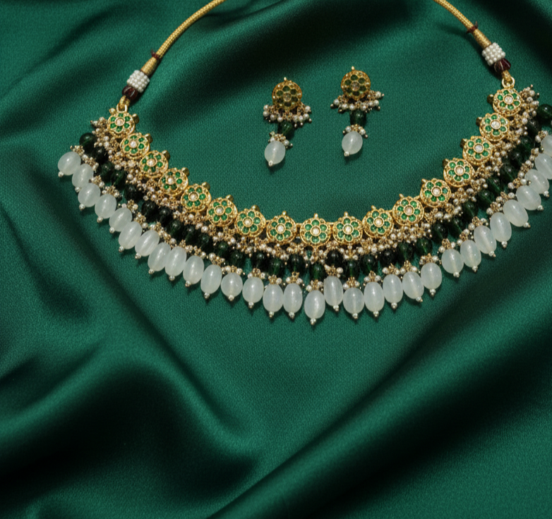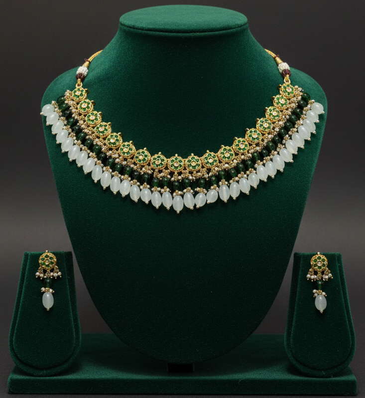 Celebrate the timeless beauty of traditional Indian craftsmanship with this vibrant and detailed jewelry set: