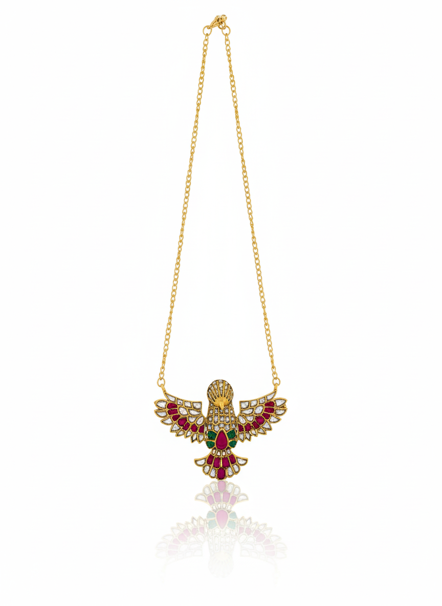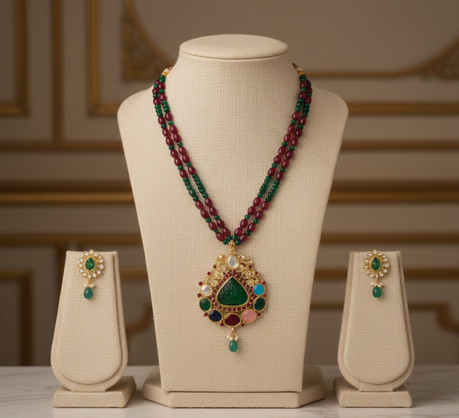• Coordinated Earrings: Includes matching stud earrings featuring the signature pear-shaped green stone, ruby-colored borders, and delicate pearl drop accents.