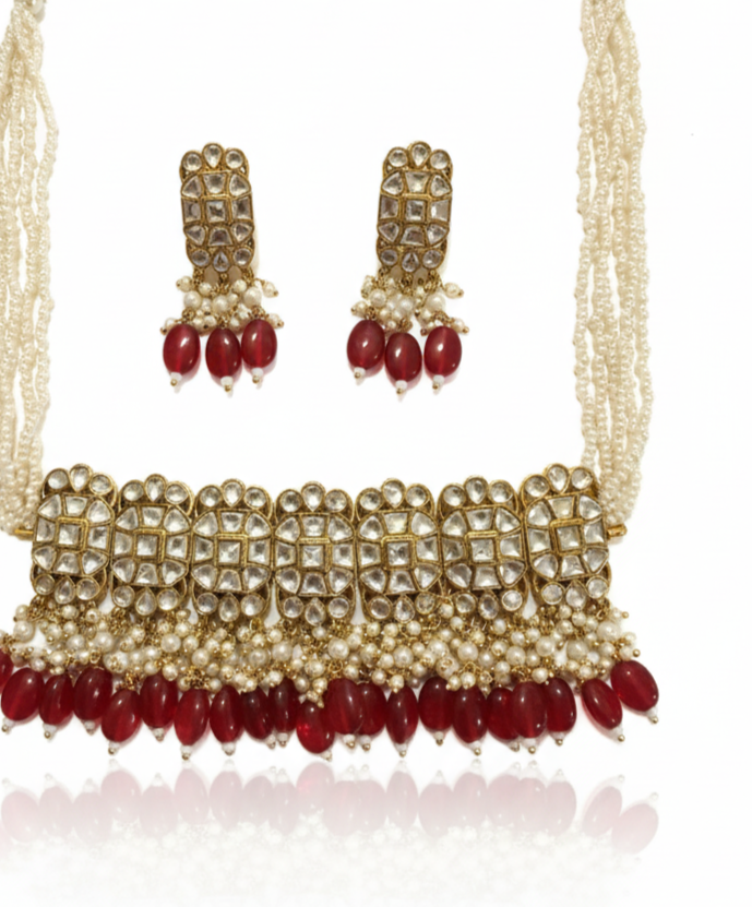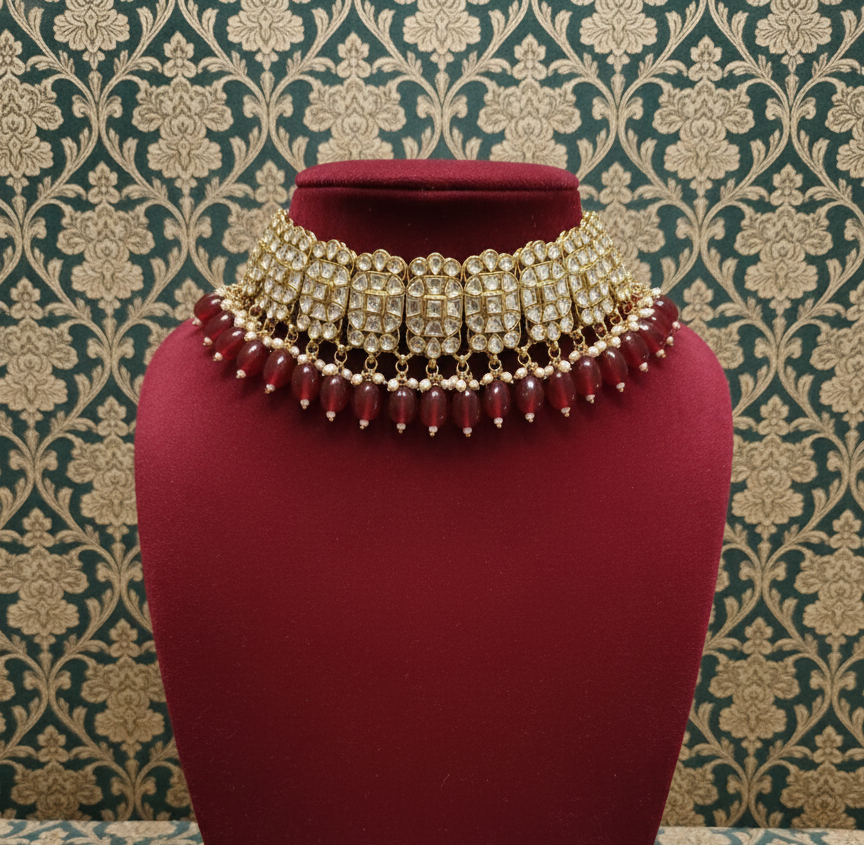 Heritage Polki Choker Set with Deep Ruby-Red Bead Droplets