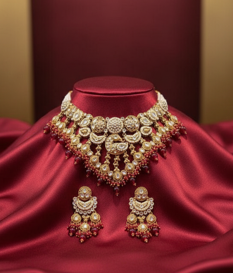 This high-end jewelry ensemble is a tribute to traditional heritage craftsmanship, designed to make a grand statement at weddings and festive celebrations.