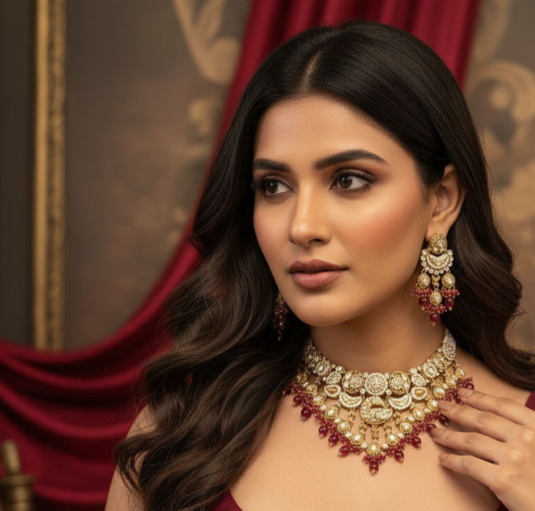 Define royal elegance with this magnificent Polki-style choker set. Featuring intricate crescent moon (Chandbali) patterns and shimmering uncut stone work, this set is beautifully bordered with vibrant ruby-red beads and clusters of seed pearls. It is an imperial choice for brides and those seeking a timeless, antique-luxe aesthetic.