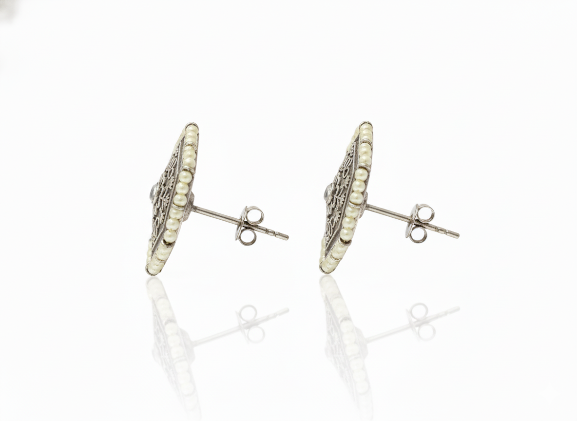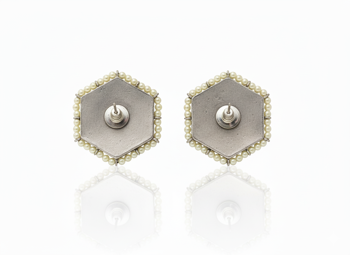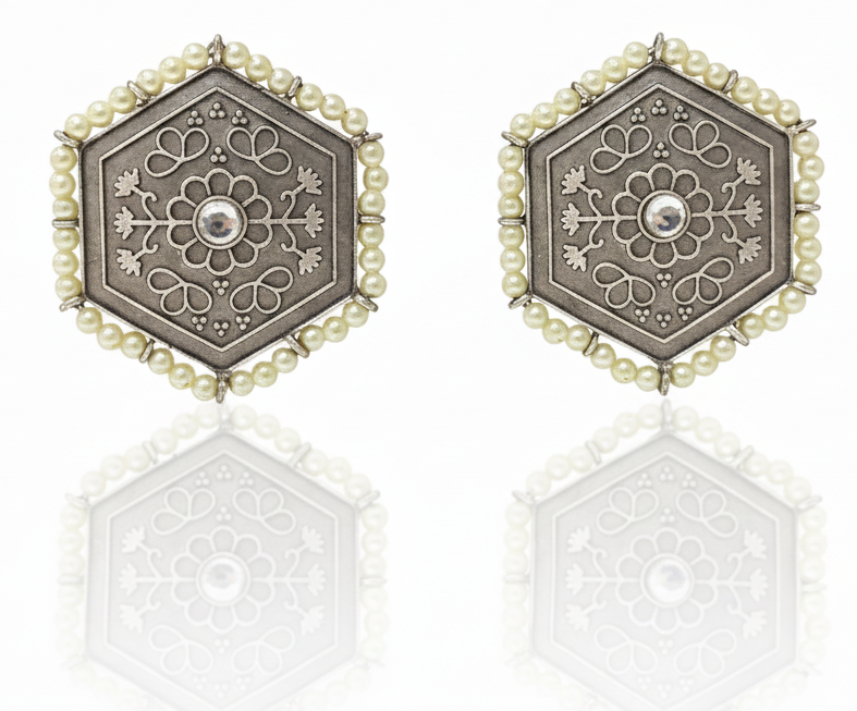 Add timeless elegance to your jewelry collection with these Hexa Pearl Stud Earrings, crafted in an antique oxidized silver finish. The unique hexagonal shape is adorned with intricate floral engravings, reflecting fine handcrafted artistry. A subtle central stone enhances the design, while a neat border of pearls adds softness and sophistication. Lightweight and comfortable, these stud earrings are perfect for everyday ethnic wear as well as festive occasions. Pair them effortlessly with sarees, kurtas, or Indo-western outfits to achieve a graceful, heritage-inspired look with understated charm.