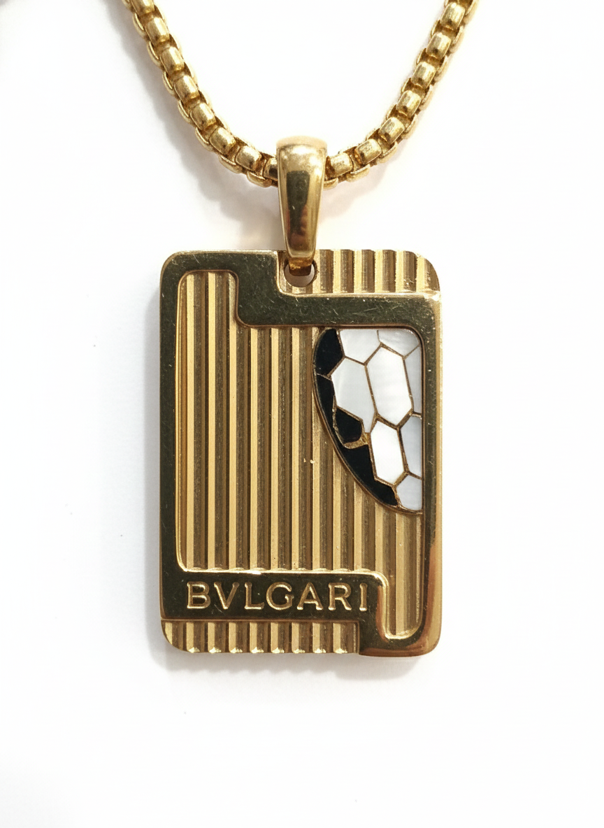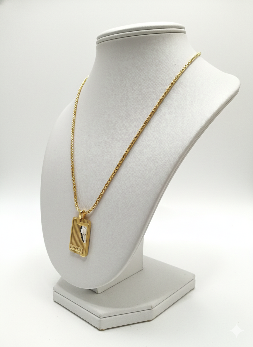 A modern gold-finish necklace featuring a rectangular ribbed pendant with a geometric enamel inlay. A sleek and authoritative accessory that blends industrial design with high-end luxury.