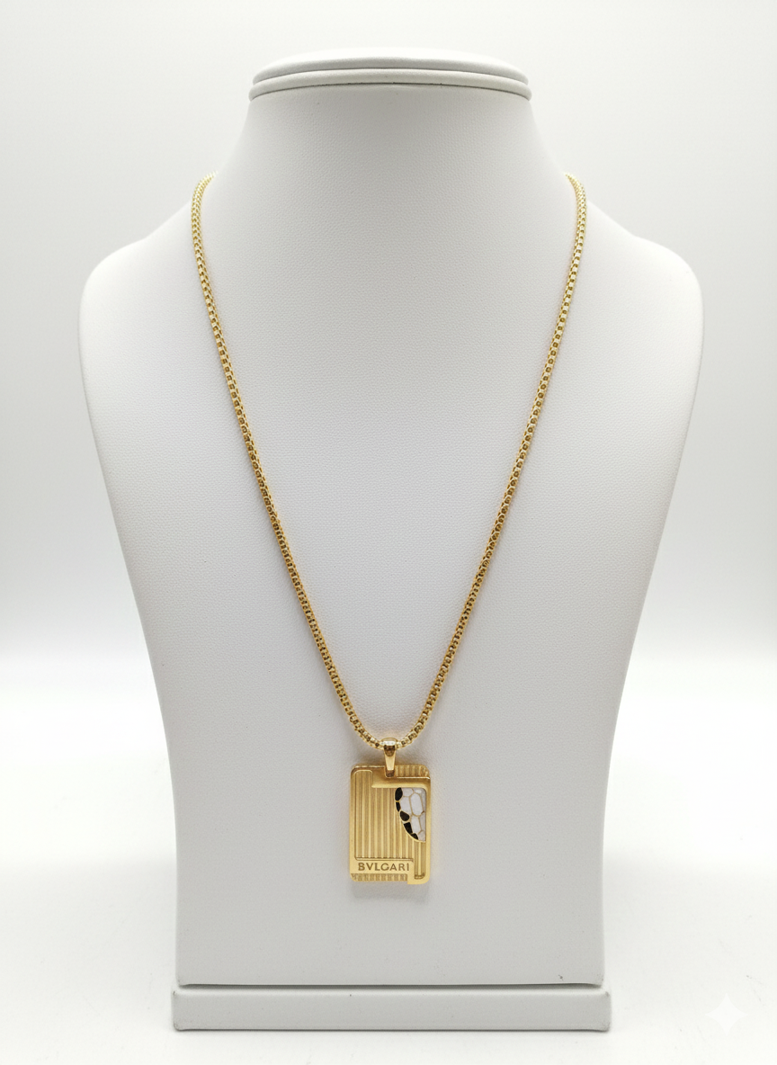Redefine your style with the Iconic Ribbed Architect Necklace. This piece centers on a substantial gold-tone rectangular pendant, meticulously designed with vertical linear grooves that provide a rich, tactile texture. A signature corner cutout reveals a striking white and black mosaic inlay, adding a touch of avant-garde contrast to the monochromatic gold finish.